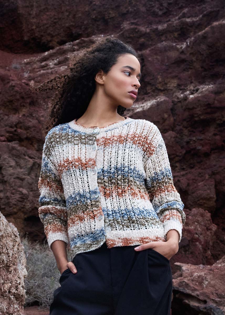 400 (400, 500, 500) g of Lana Grossa Gomitolo Hippie (66% cotton, 30% hemp, 4% linen; 300 m/100 g) in Blue Grey/Umbra/Nougat/Pink Beige/Natural (col 3038). Size 2.5 and 3 mm needles; short size 2.5 mm circular needle; six 18 mm mother-of-pearl buttons