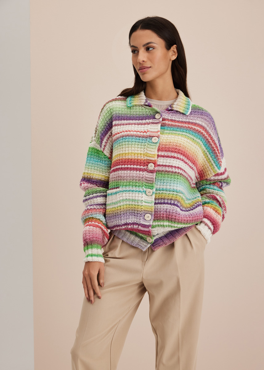 400 (400, 600, 600) g of Lana Grossa Gomitolo Magico (60% pure wool, 40% acrylic; 700 m/200 g) in Light Green/Yellow Green/Yellow/Beige/Ecru/Grey Violet/Berry/ Brown/Green/Turquoise/Wine Red (col 3027). Size 3.5 and 4 mm needles; size 3.5 mm circular needle; six 23 mm buttons in beige [by Union Knopf, item 38564, col 16].