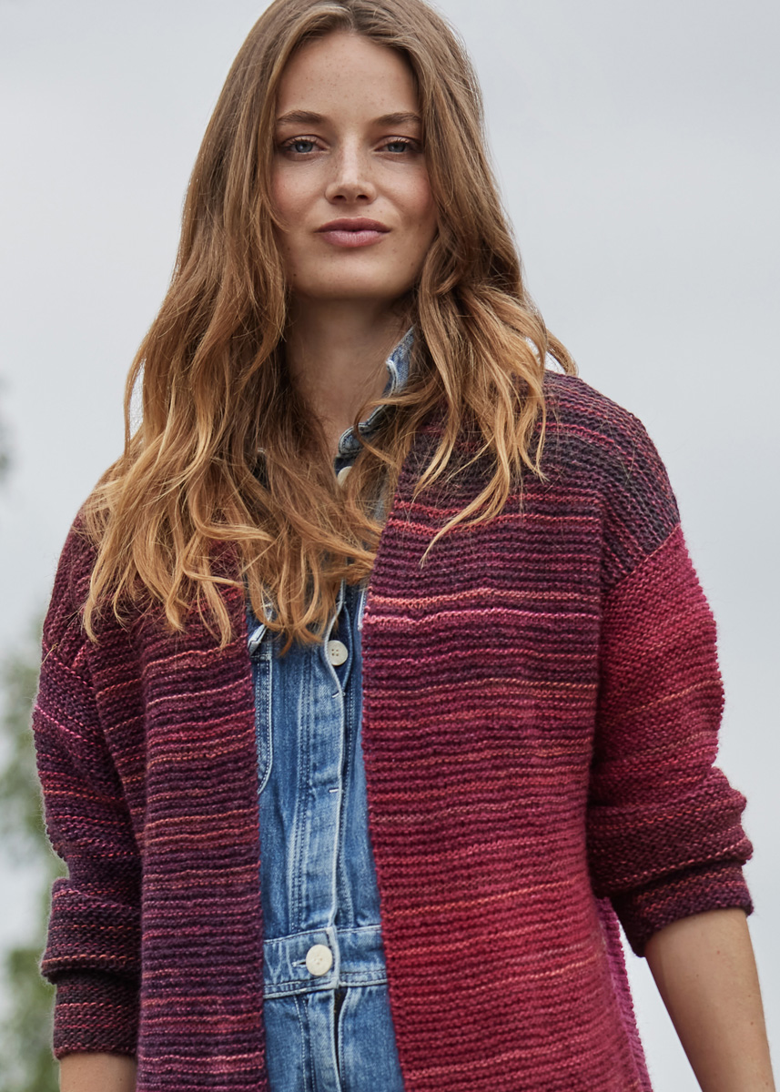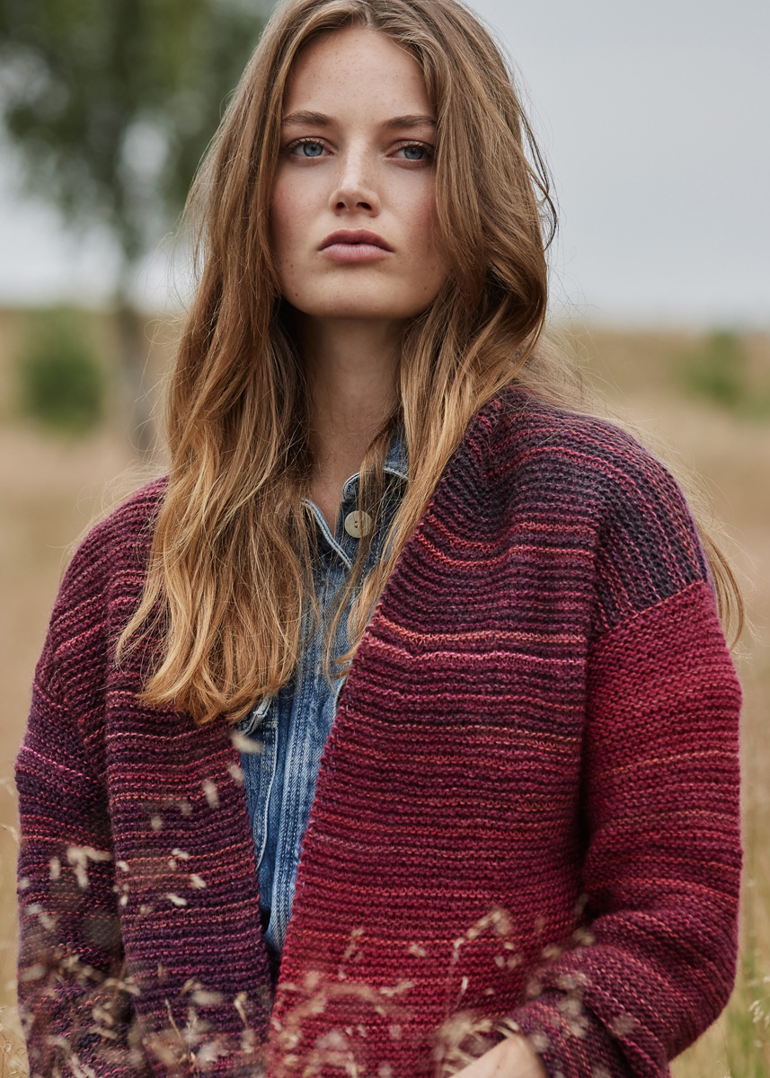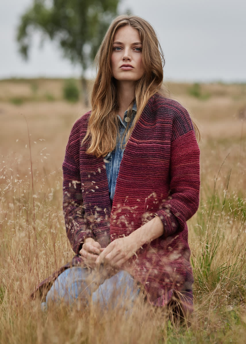 400 (600, 600, 600) g of Lana Grossa Gomitolo Maya (60% pure wool, 40% acrylic; 700 m/200 g) in Fuchsia/ Wine Red/Black Red/Aubergine/Pink (col 855). Size 3.5 mm needles