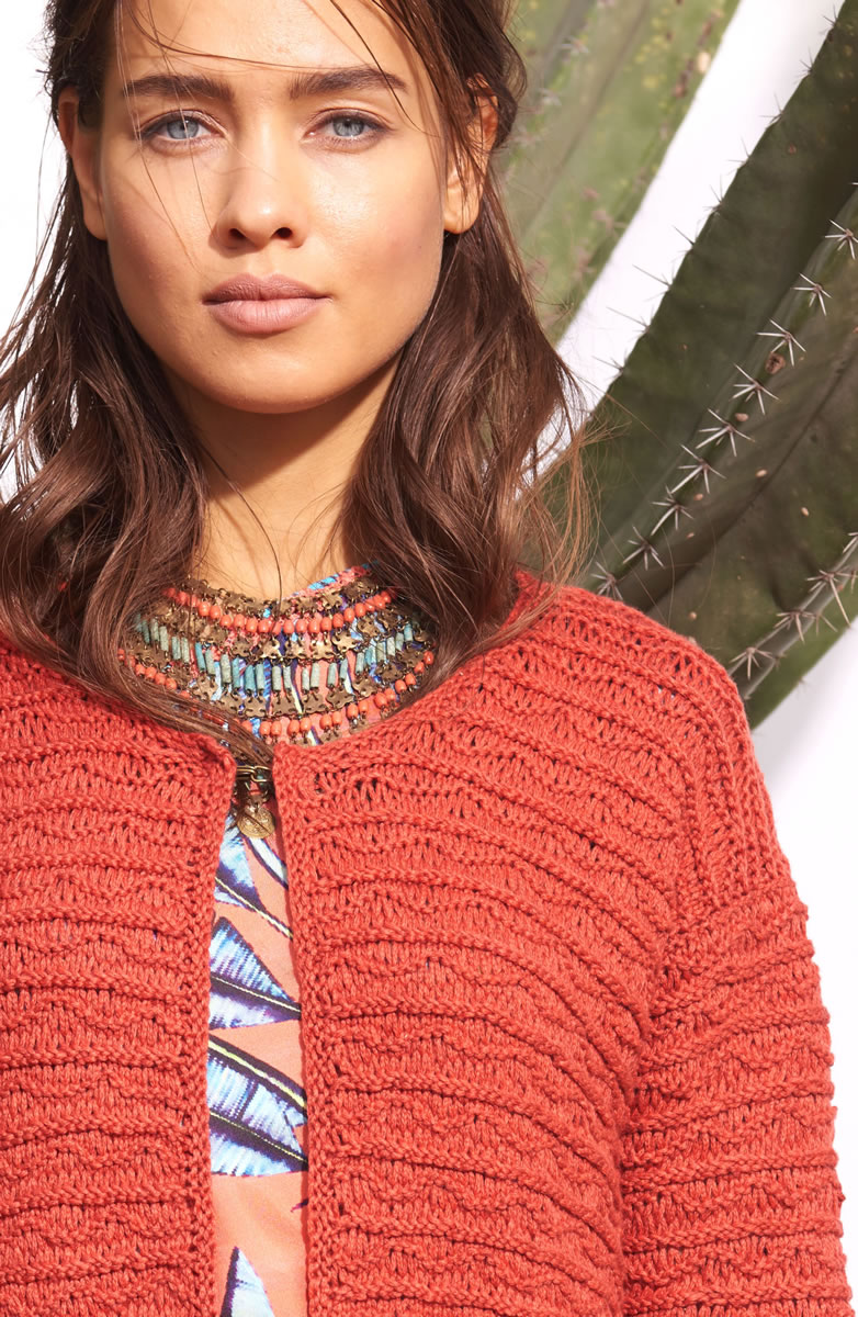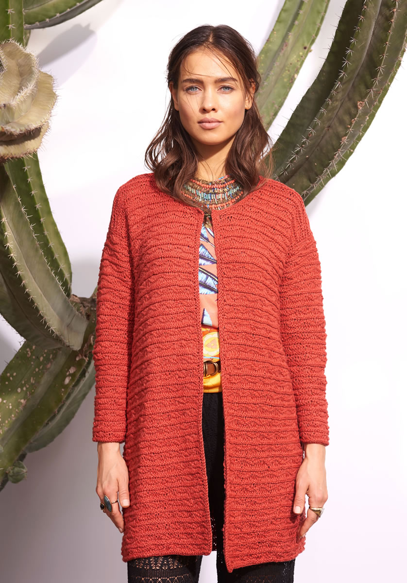 550 (600, 650) g of Lana Grossa 365 Yak (66% cotton, 22% polyamide, 12% yak; 145 m/50 g) in Red/Dark Red (col 20). Size 5 mm needles; size 4.5 mm circular needle, 80 cm long; one 25 mm hookandeye closure in brass [by Union Knopf, item 59421, col 851].