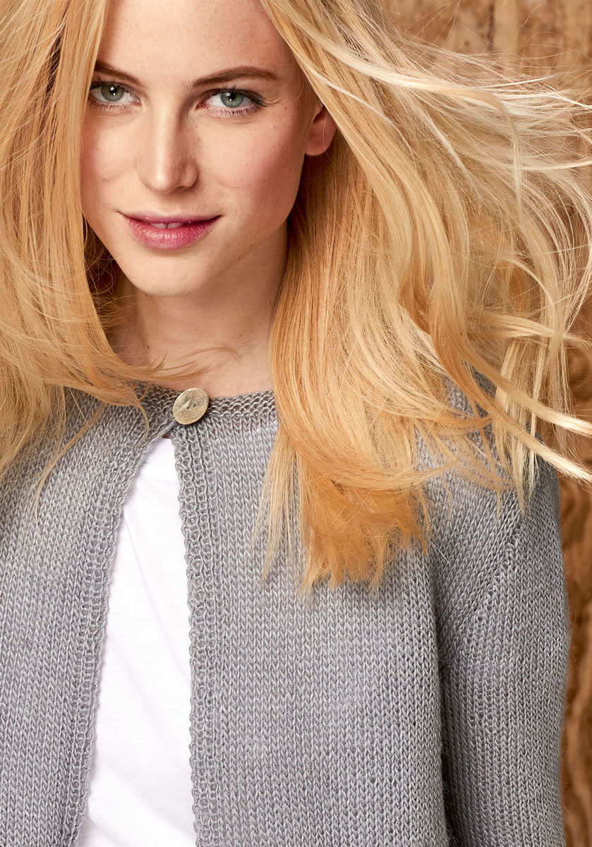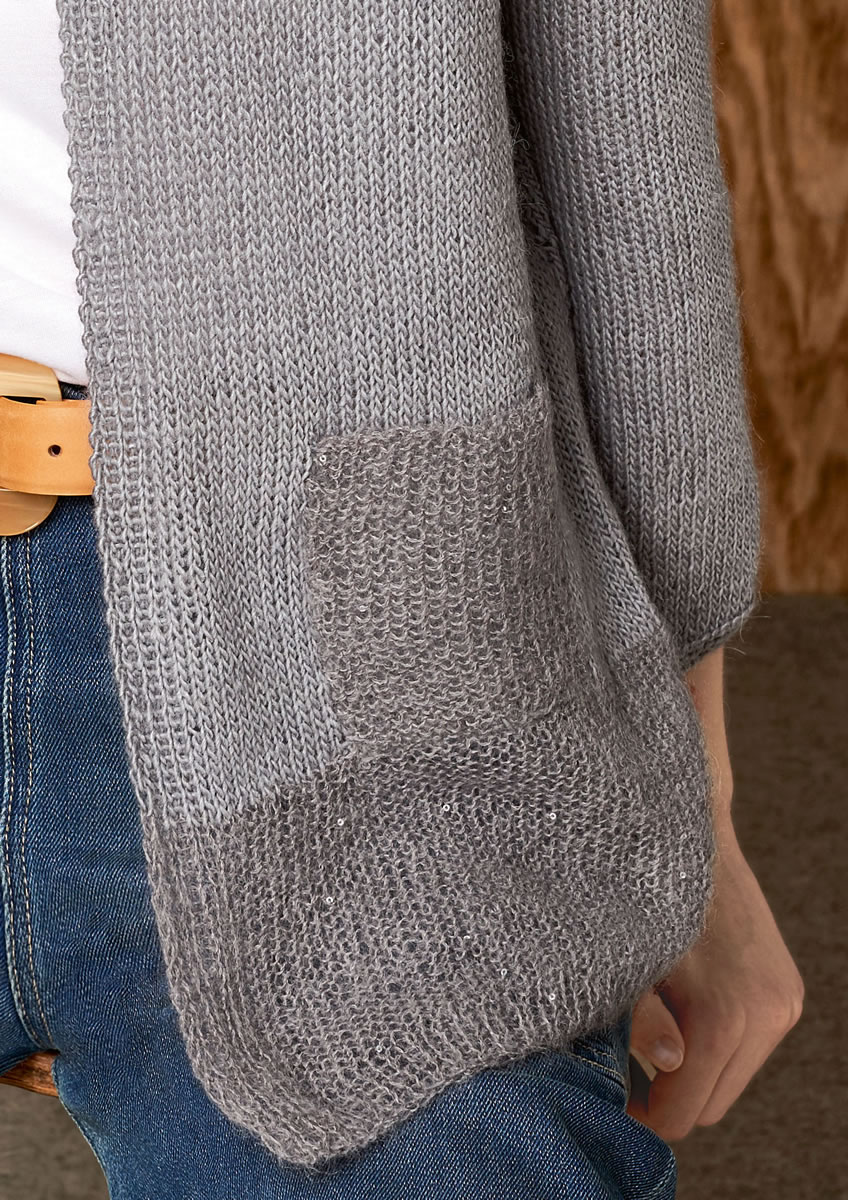 150 g of Lana Grossa Lace Seta (70% baby alpaca, 30% silk; 250 m/50 g) in Grey (col 14) and 25 g of Lana Grossa Silkhair Paillettes (61% superkid mohair, 11% silk, 11% wool, 17% nylon; 175 m/25 g) in Taupe (col 404). Size 5 mm needles; size 5 mm circular needle; size 4 mm crochet hook; one 22 mm mother-of-pearl button [by Union Knopf, item 452583].