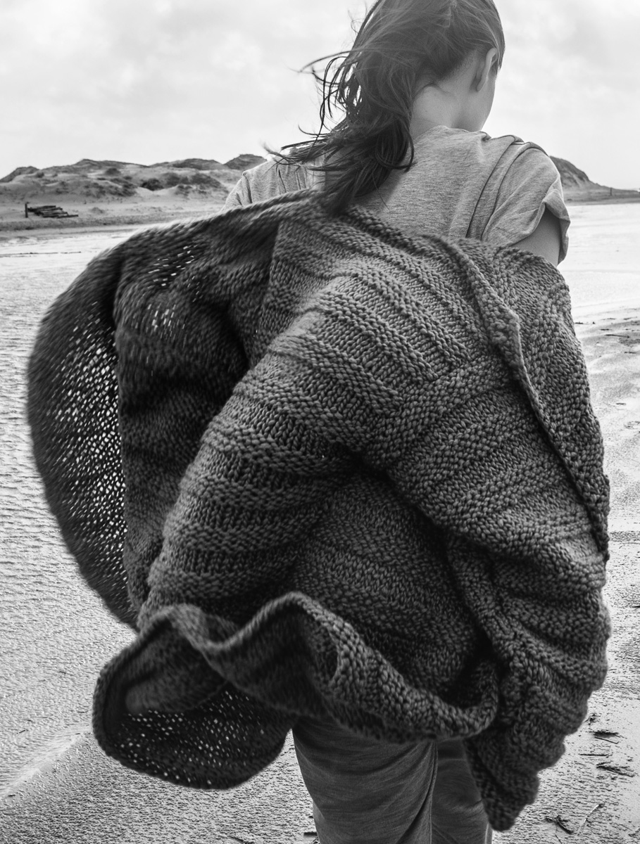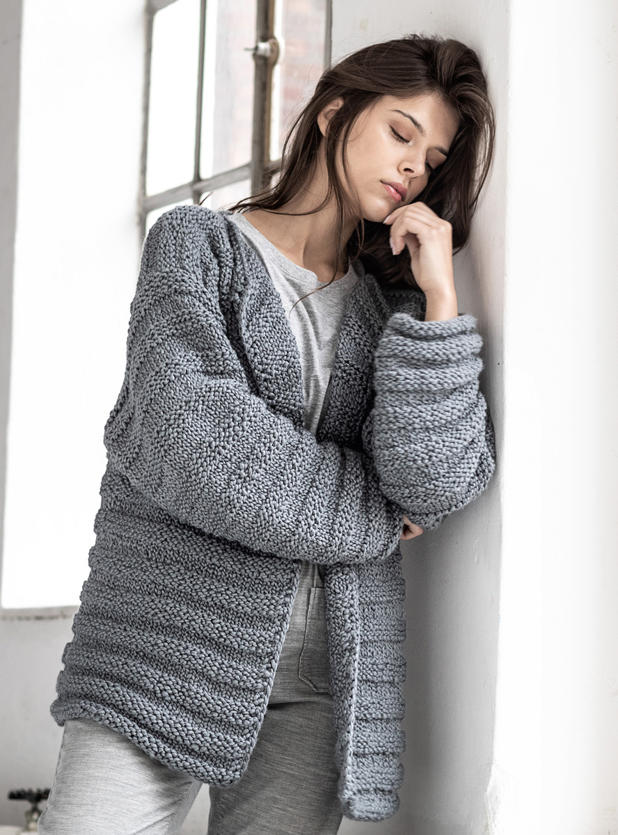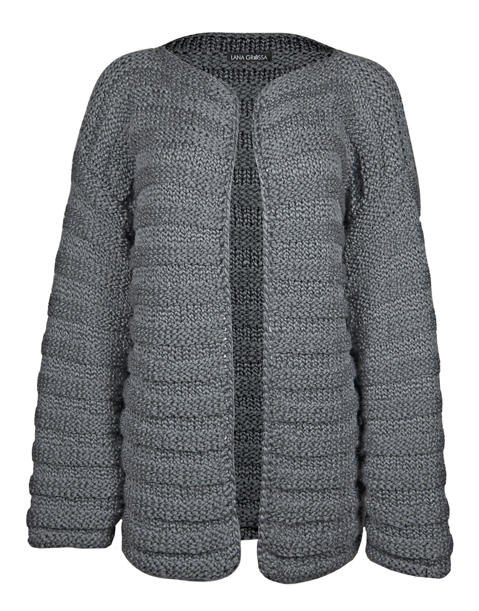 850 (950, 1050) g of Lana Grossa Lala Berlin Chunky (80% pure wool, 15% silk, 5% polyamide; 50 m/50 g) in Grey (col 10). Size 8 needles; size 6 mm crochet hook