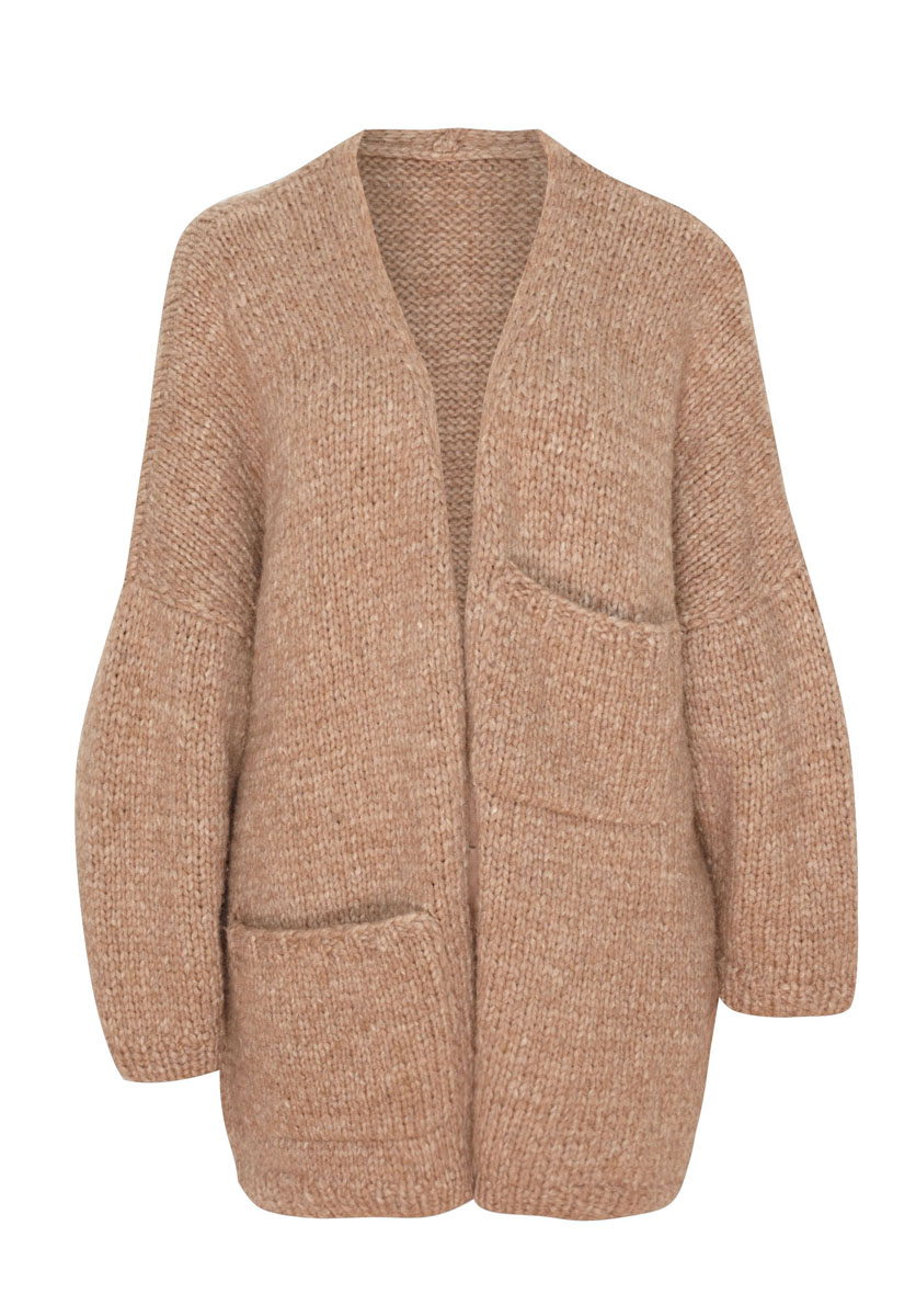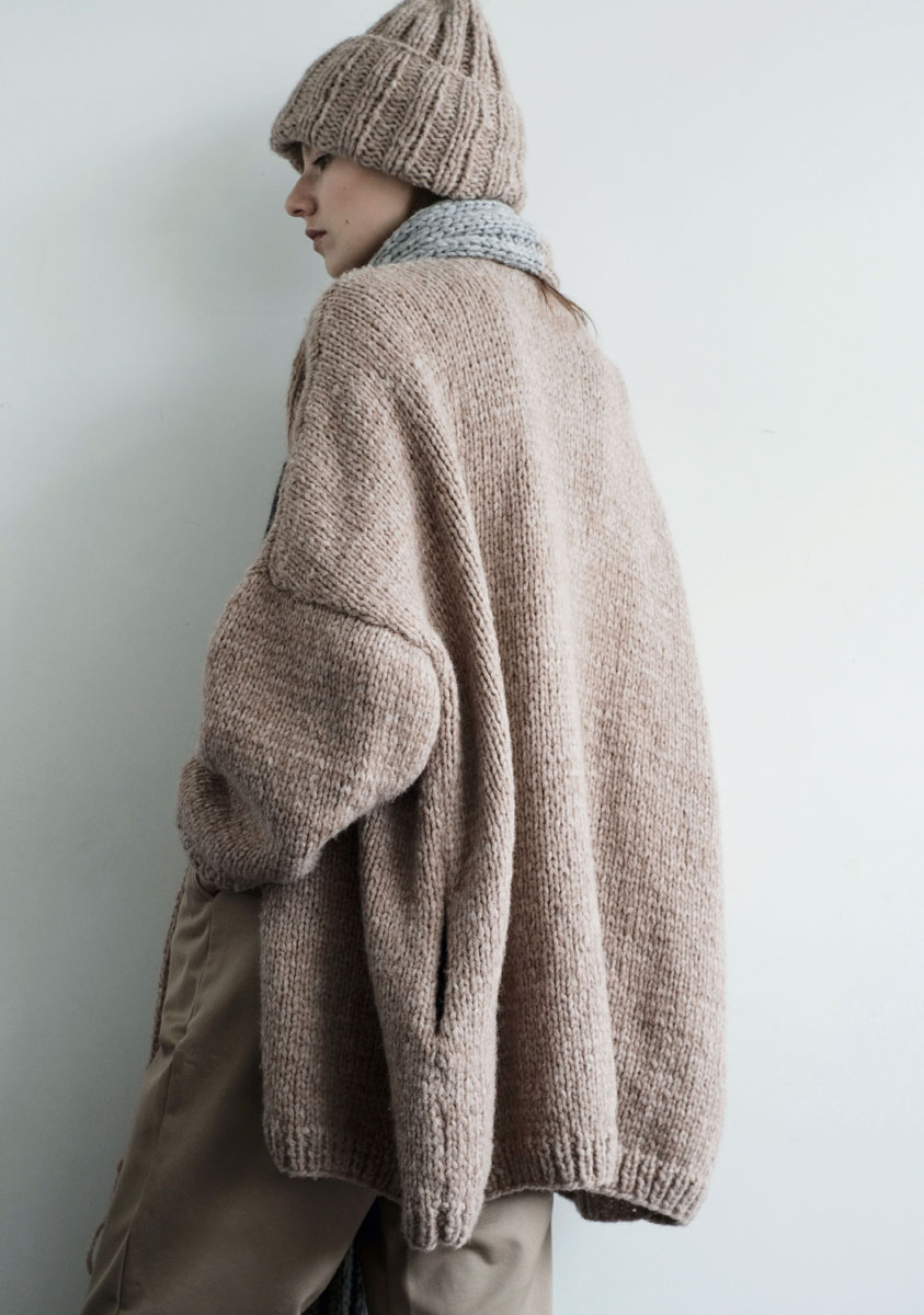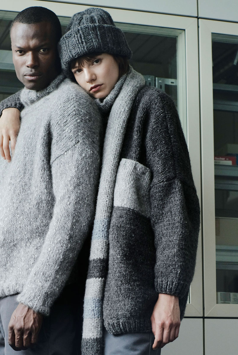 Lana Grossa Lala Berlin Lovely (52% alpaca, 18% cashmere, 18% pure wool, 12% polyamide; 90 m/50 g). Size 6 and 7 mm needles. Version A: 650 (700, 750) g in Charcoal (col 7) and 50 g in Light Grey Melange (col 6). Version B: 700 (750, 800) g in Camel Melange (col 14