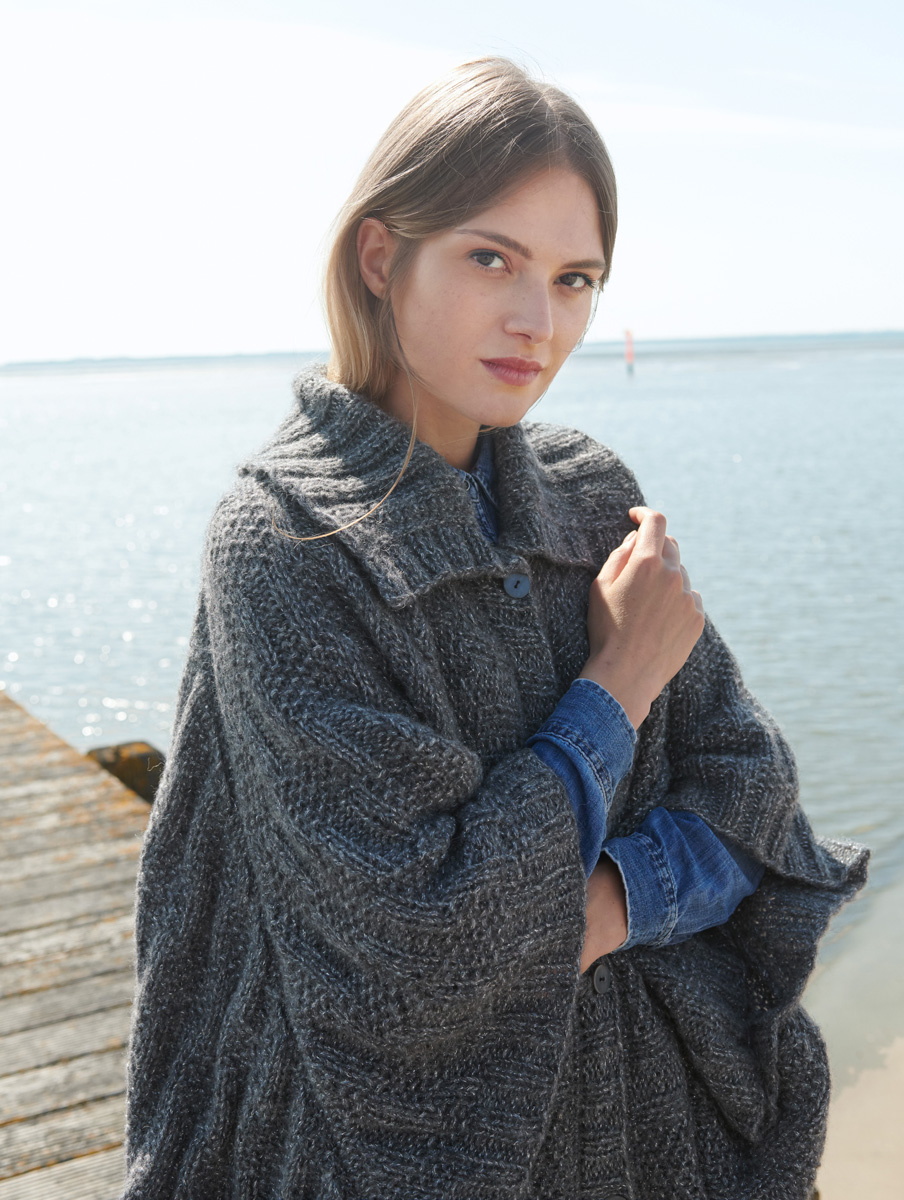 550 g of Lana Grossa Lala Berlin Shiny (46% baby alpaca, 30% cotton, 8% Merino wool, 8% polyester, 8% polyamide; 150 m/50 g) in Grey (col 6). Size 6 and 7 mm circular needles, 80 and 120 cm long; size 5 mm crochet hook; four 20 mm mother-of-pearl buttons in dark grey [by Union Knopf, item 453037, col 78]