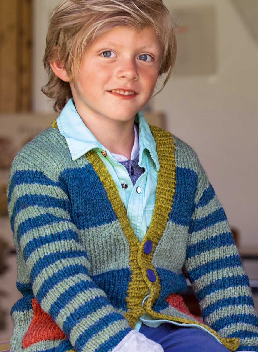 150 (200) g of Lana Grossa Landlust Merino 120 (100% superwash Merino wool; 120 m/50 g) in Indigo Blue (col 126), 100 (150) g in Mint (col 129) and 50 g each in Coral (col 130) and Pistachio (col 114). Size 5.5 and 6 mm needles; size 5.5 mm circular needle, 80 cm long; five 18 mm buttons in blue [by Union Knopf, item 453064.].