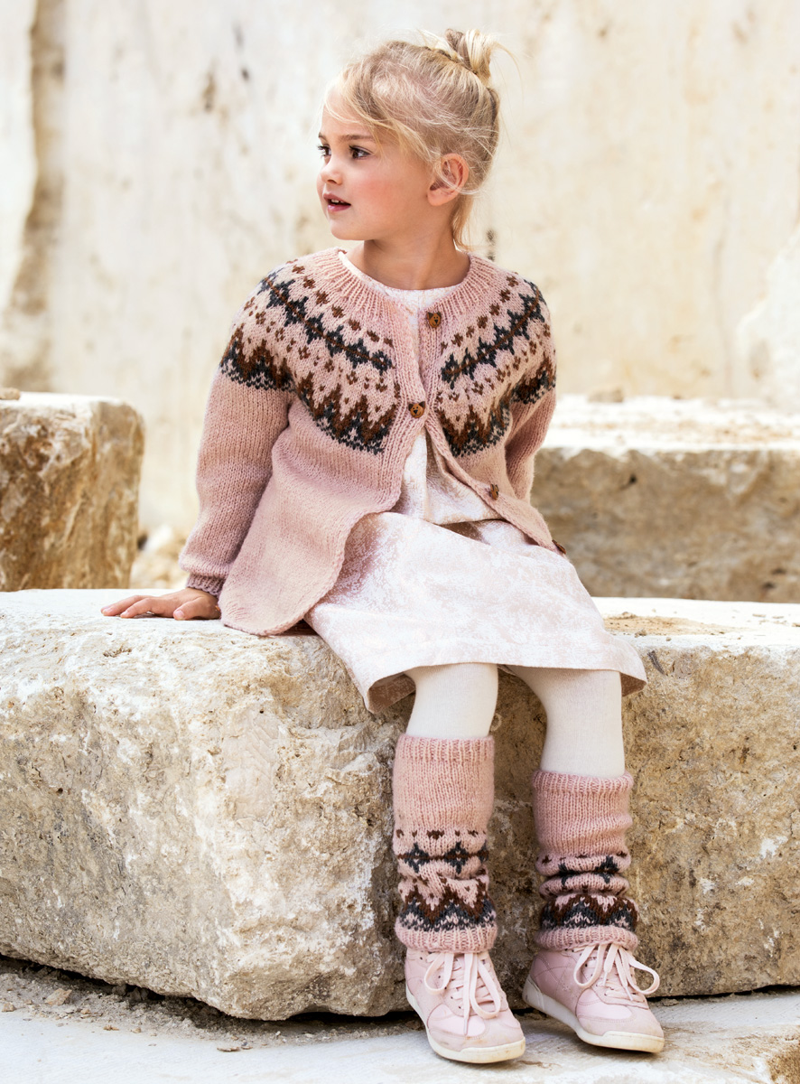150 (200, 250) g of Lana Grossa Landlust Merino 180 (100% superwash Merino wool; 180 m/50g) in Pastel Pink (col 202) and 50 g each in Dark Grey (col 219) and Doe Brown (col 227). Size 5 and 6 mm needles; size 6 mm circular needles, 80,60 and 40 cm long; size 5 mm circular needle, 40 cm long; six buttons [by Union Knopf, item 450060, col 20]