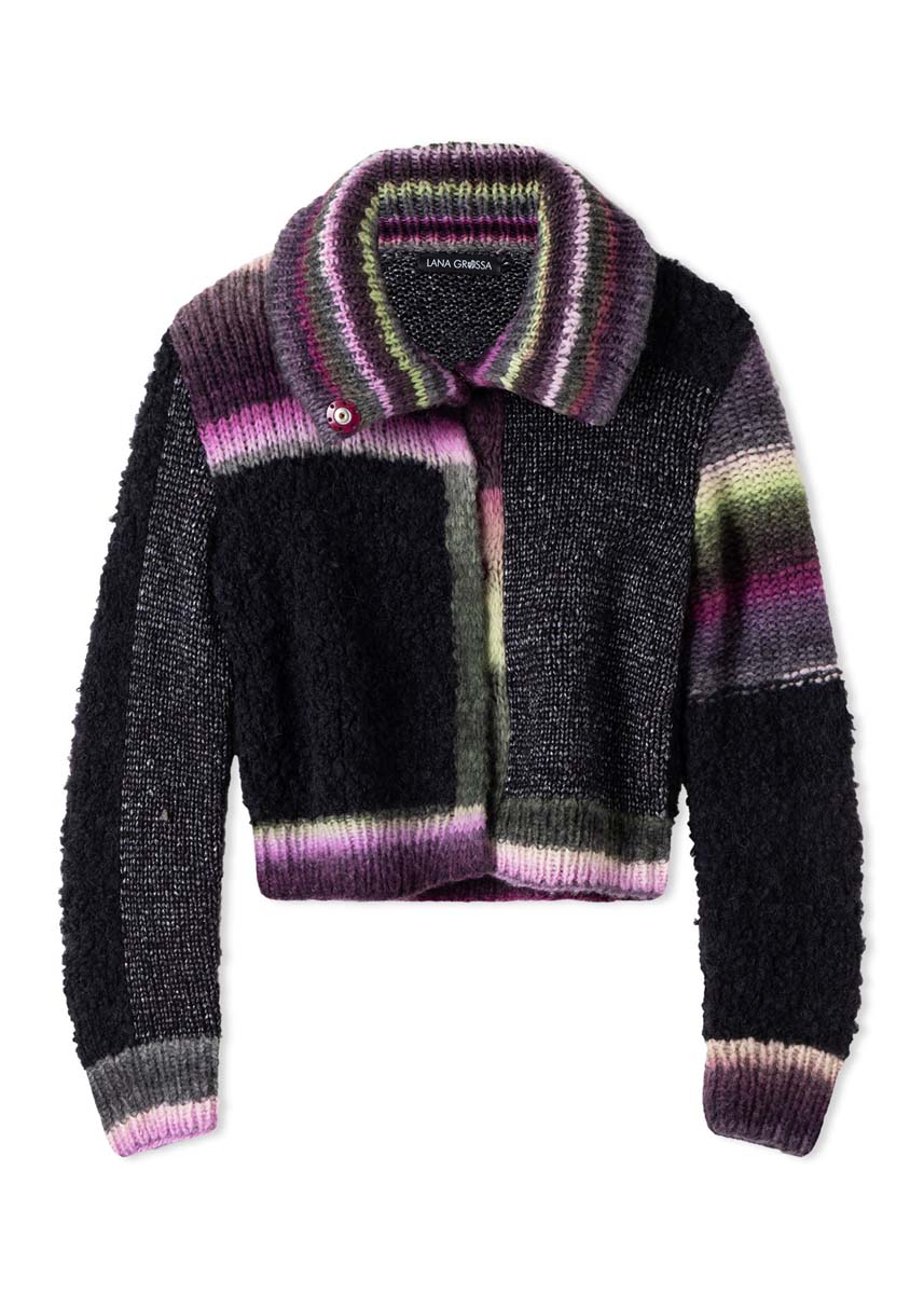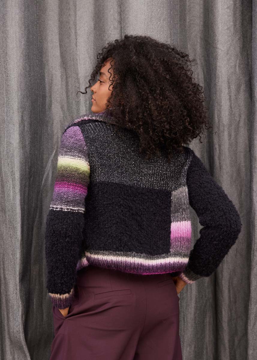 Lana Grossa Lucida (58 % Virgin wool Merino, 42 % Viscose, approx. 100 m/50 g), 100 g anthracite (col 6) und Lana Grossa Bomba (85 % Virgin wool Merino, 15 % Polyamide, approx. 290 m/100 g) 200 (200 - 300) g orchid/blackberry/ sweet lime/subtle yellow/gray green/plum/peach/ dark gray/dark red/rose/pink/subtle green (col 10) and Lana Grossa Orsetto (60 % Virgin wool Merino, 40 % Alpaca), approx. 75 m/50 g), 200 (200 - 250) g black (col 15); knitting needles size 4 mm and 6 mm; 1 circular knitting needle size 4 mm; 2 double pointed needles (for putting sts on hold); 6 sew-on press studs, approx. 25 mm Ø darkred.