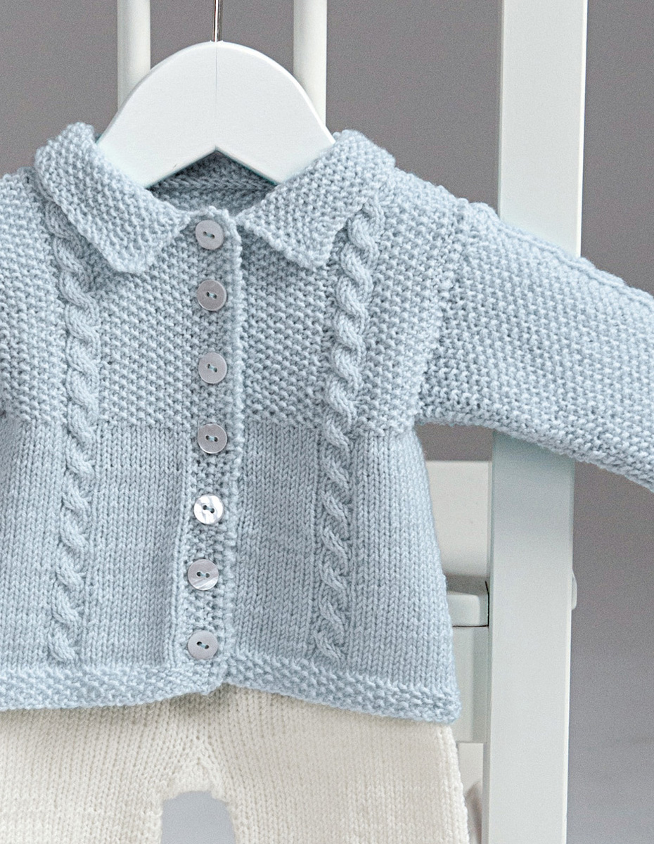 100 g of Lana Grossa Cool Wool Baby (100% pure wool; 220 m/50 g) in Light Blue (col 208) and 50 g in White (col 207). Size 3 mm needles; size 3 mm circular needle, 40 cm long; cable needle [cn]; seven buttons; waistband elastic