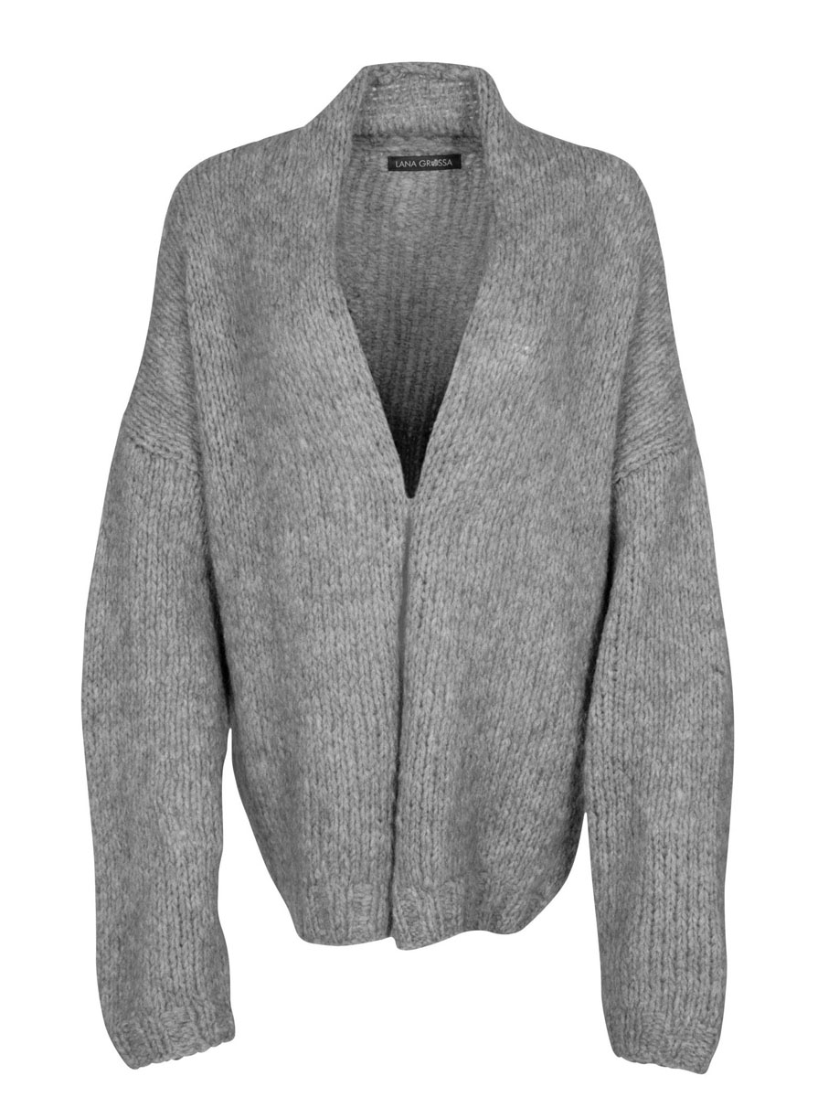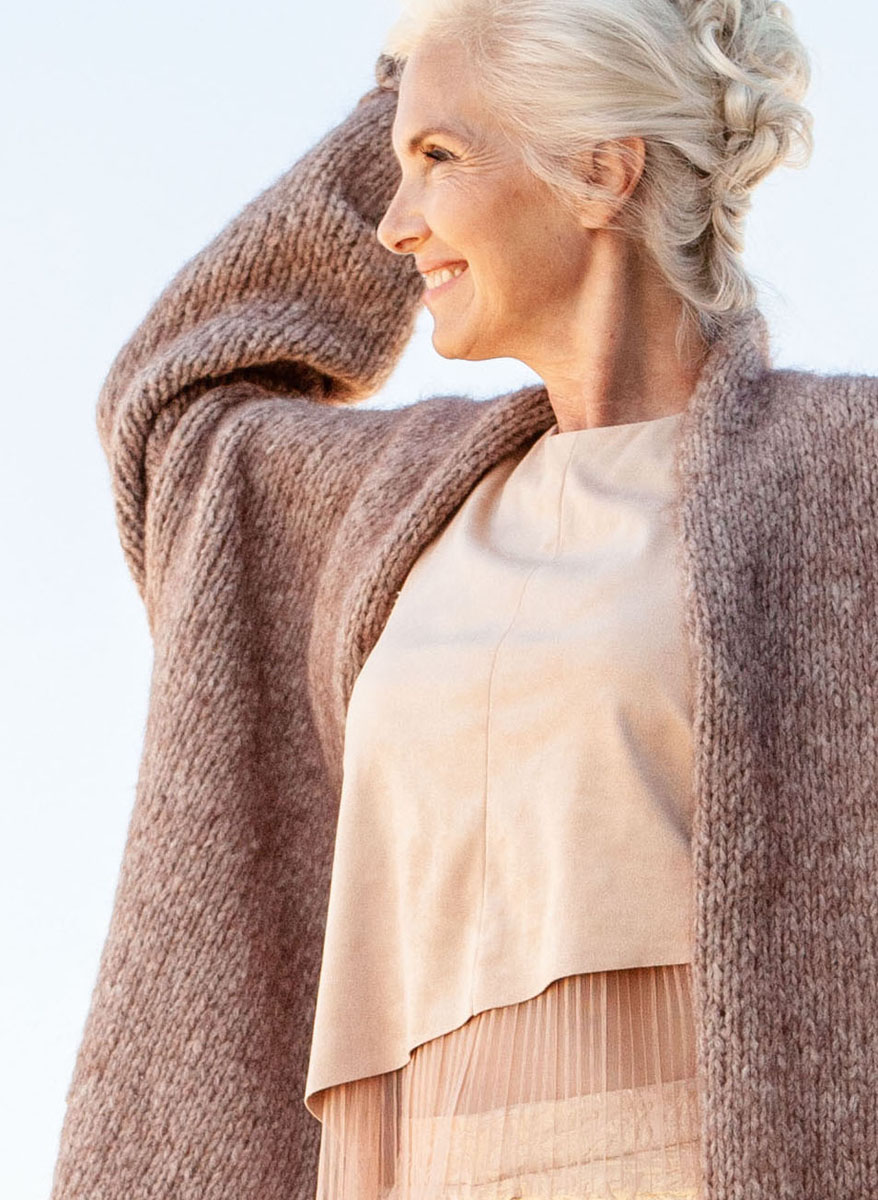 450 (500, 550) g of Lana Grossa Peloso (54% Merino wool, 26% mohair, 20% acrylic; 210 m/50 g) in Greige (col 8). Size 5.5 and 7 mm needles