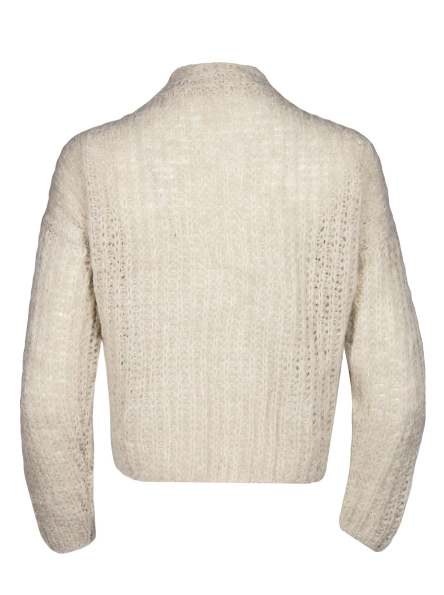 200 (250, 300) g of Lana Grossa Peloso (54 % pure wool, 26 % mohair, 20 % acrylic; 210 m / 50 g) in Natural (col 1). Size 4 mm needles; three 24 mm buttons