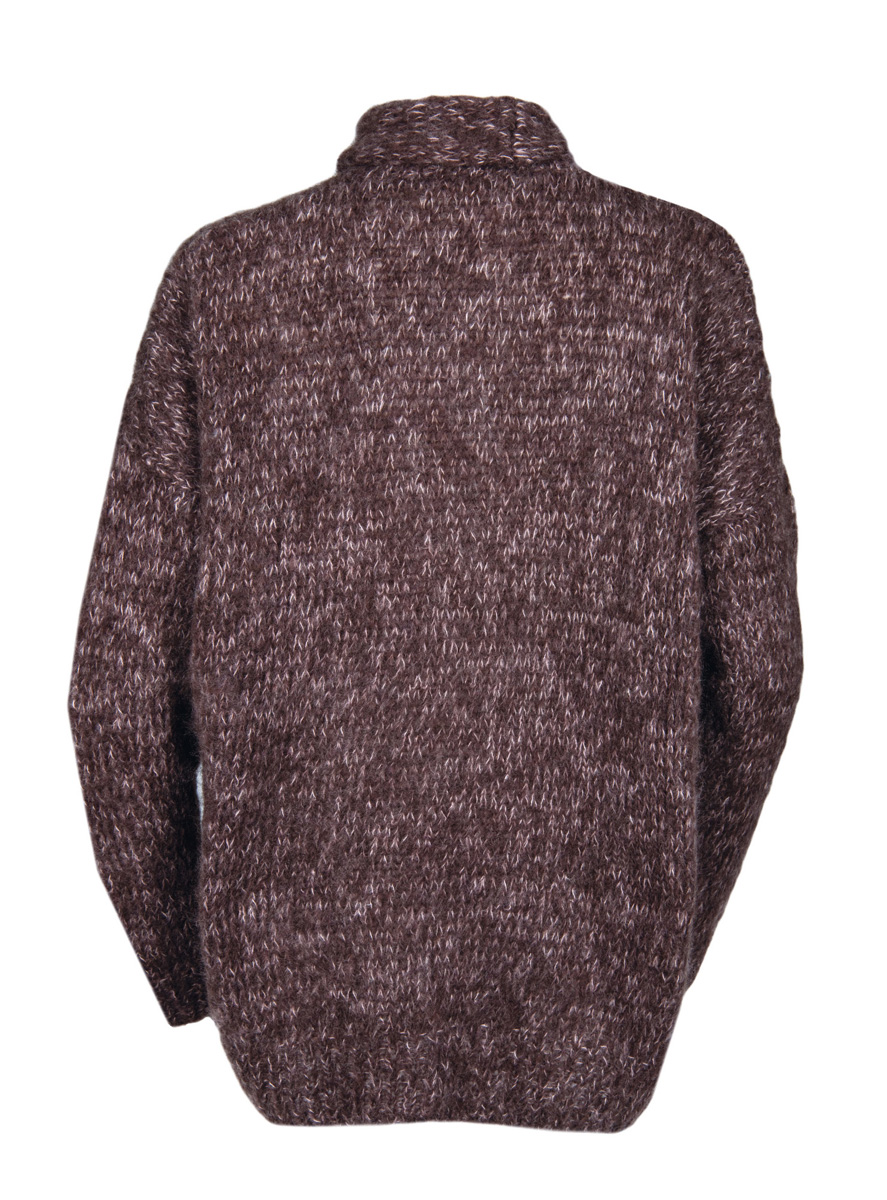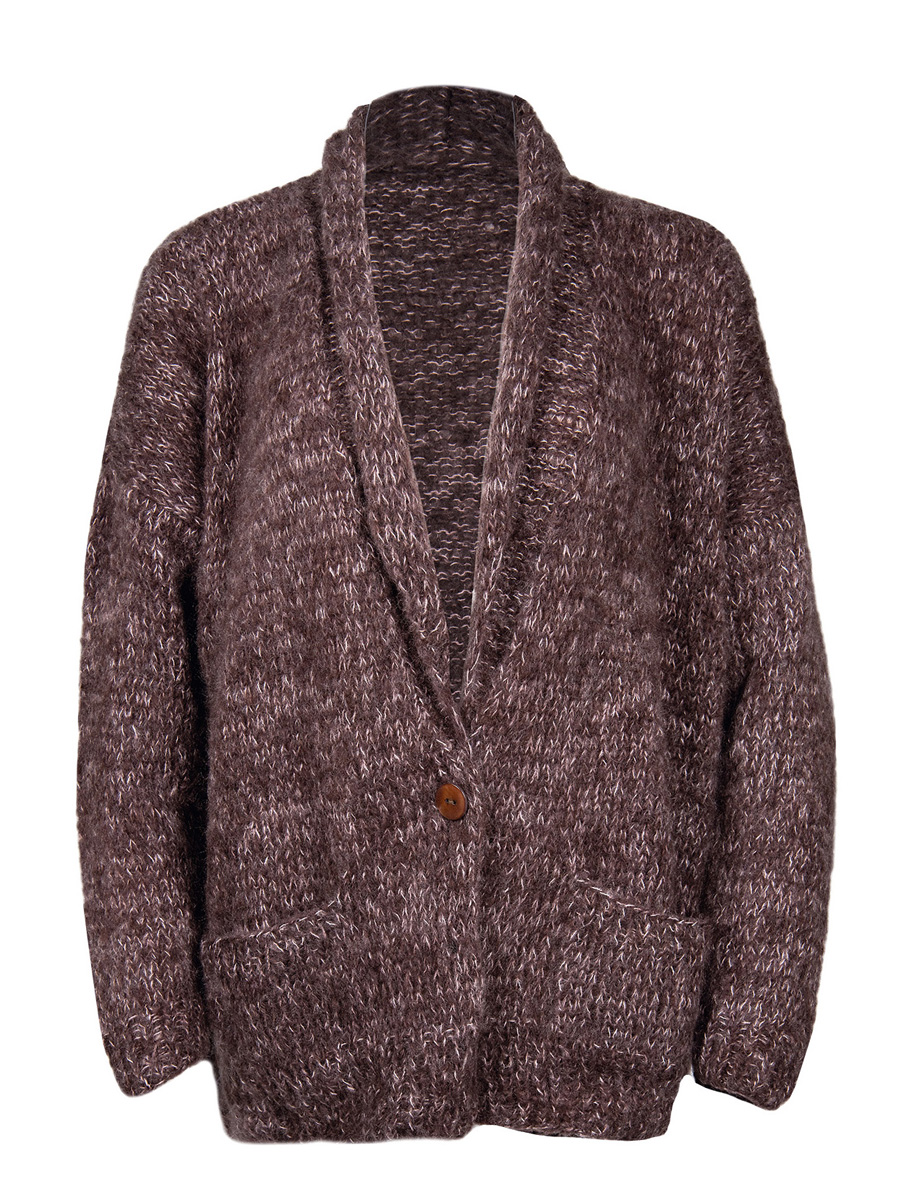250 (300, 350) g of Lana Grossa Peloso (54 % pure wool, 26 % mohair, 20 % acrylic; 210 m / 50 g) in Chestnut (col 11) and 125 (150, 175) of Lana Grossa Silkhair (70 % superkid mohair, 30 % silk; 210 m / 25 g) in Pink (col 85). Size 4 and 5 mm needles; three 25 mm buttons