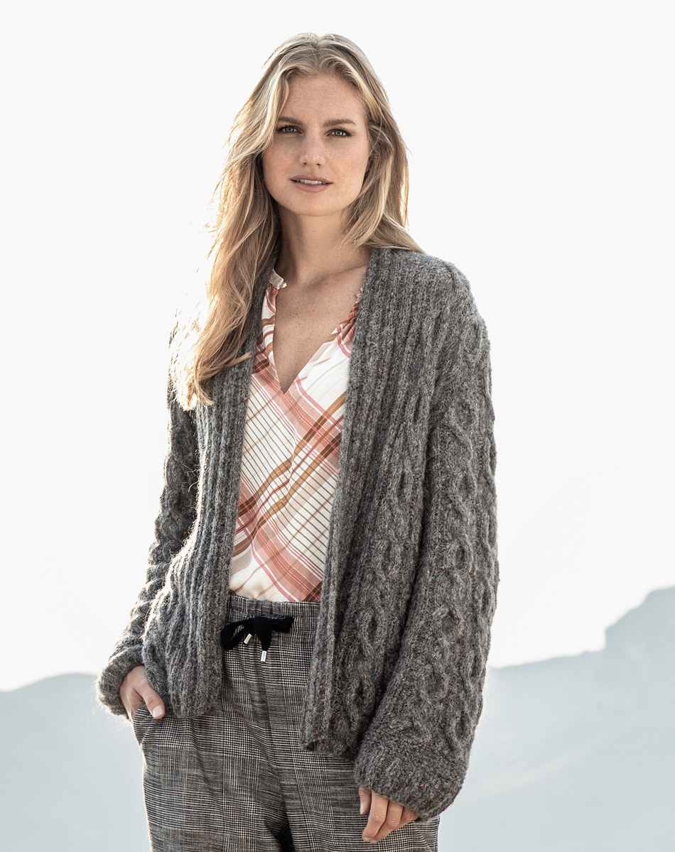 400 (500, 600) g of Lana Grossa Peru Tweed (40% alpaca, 32% viscose, 20% polyamide, 8% pure wool; 175 m/50 g) in Grey (col 4). Size 5 mm needles; cable needle [cn].