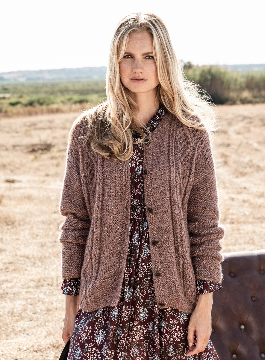 300 (350, 400) g of Lana Grossa Peru Tweed (40% alpaca, 32% viscose, 20% polyamide, 8% pure wool; 175 m/50 g) in Rosewood (col 3). Size 3.5 and 4.5 mm needles; size 3.5 mm circular needles, 40 and 60 cm long; cable needle [cn]; six 15 mm buttons