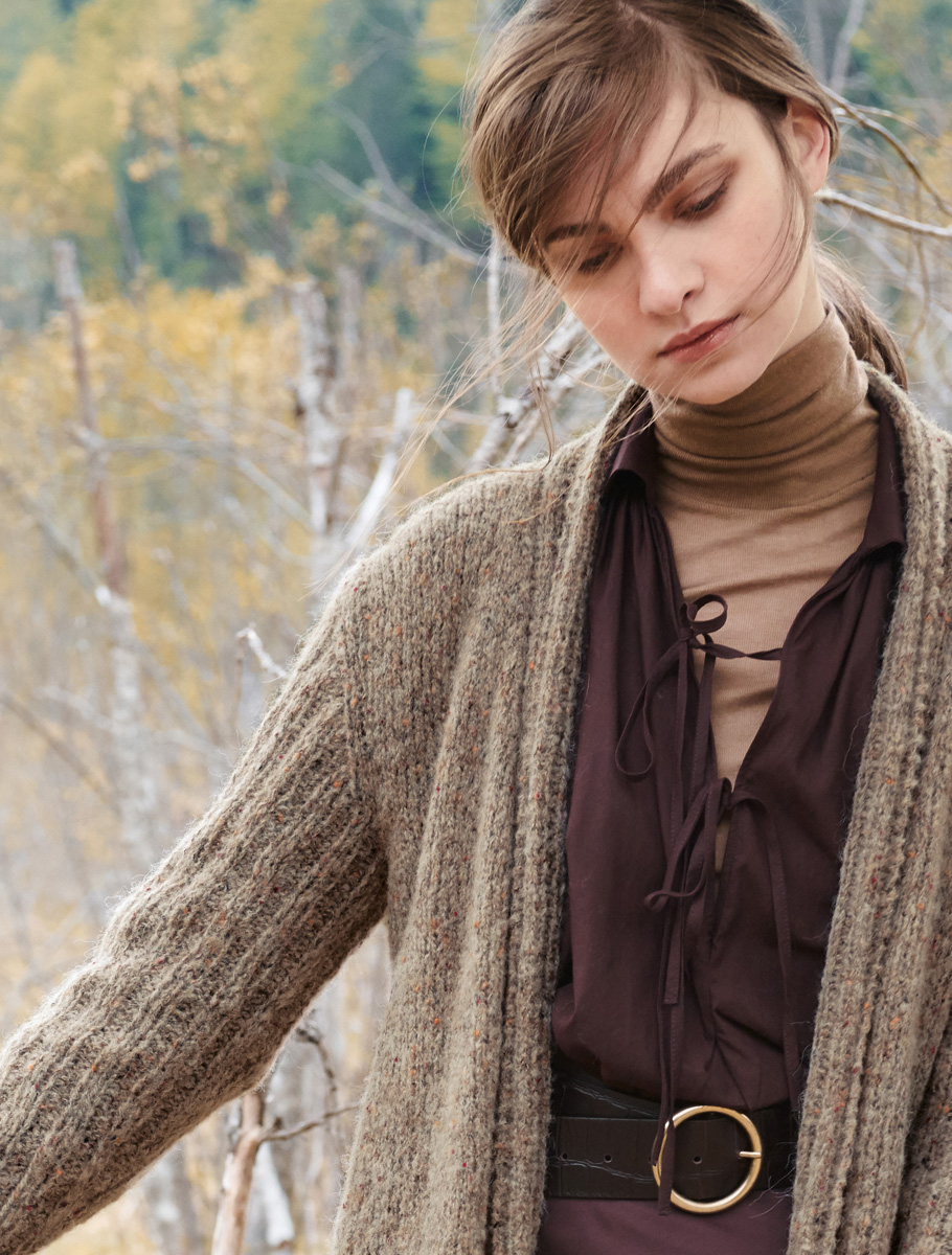 400 (450, 500, 550) g of Lana Grossa Peru Tweed (40% baby alpaca, 8% extrafine Merino wool; 32% viscose, 20% polyamide; 175 m/50 g) in Beige (col 2). Size 4.5 mm needles