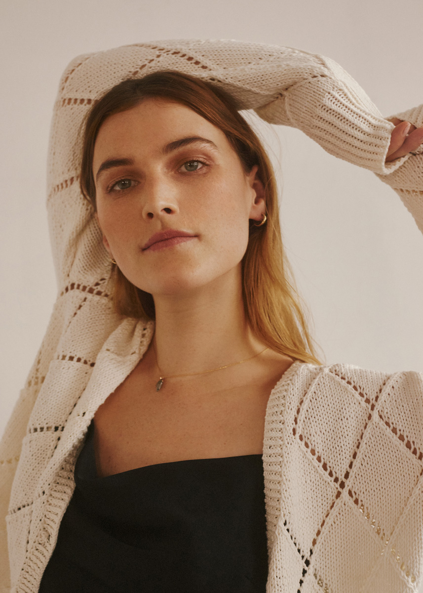 450 (500, 550) g of Lana Grossa Pima (100% Pima cotton; 125 m/50 g) in Ecru (col 22). Size 2.5 and 3.5 mm needles; size 2.5 mm circular needle; four 20 mm mother- of-pearl buttons