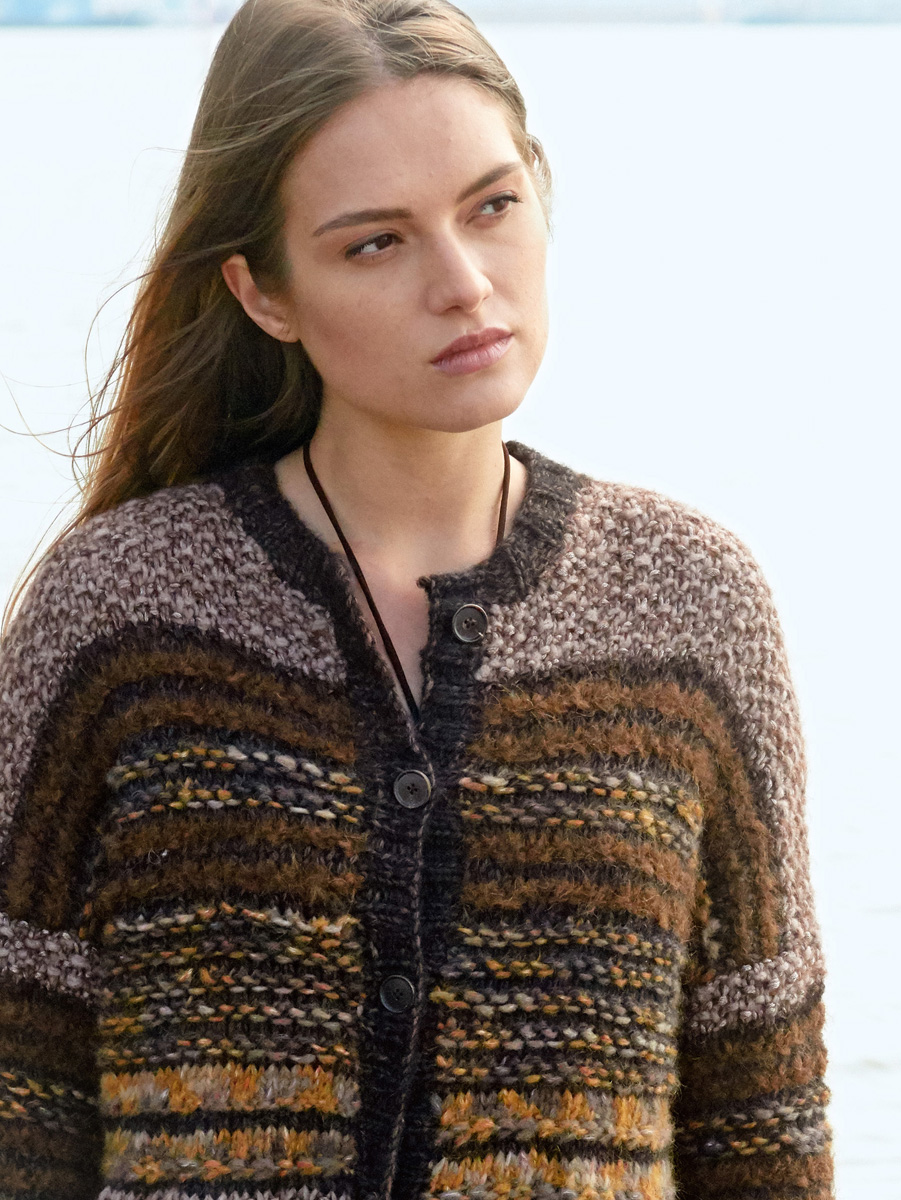 250 (300) g of Lana Grossa Piuma (75% pure wool, 15% alpaca, 10% polyamide; 140 m/50 g) in Grey- Brown/Dark Grey/Black (col 7); 100 (150) g of Lana Grossa Lala Berlin Furry (90% alpaca, 10% polyamide; 75 m/50 g) in Brown (col 4); 100 (150) g of Lana Grossa Peloso (54% Merino wool, 26% mohair, 20% acrylic; 210 m/50 g) in Greige (col 8); 50 (75) g of Lana Grossa Mia (30% mohair, 26% pure wool, 25% silk; 19% polyamide; 105 m/25 g) in Brown (col 9); 150 (200) g of Lana Grossa Brigitte No. 2 Tweed (41% cotton, 37% pure wool; 22% mohair; 100 m/50 g) in Orange/ Taupe/Grey-Brown (col 111). Size 5.5, 6 and 7 mm circular needles, each 80 cm long; seven 20 mm horn buttons in dark brown [by Union Knopf, item 47685, col 22]