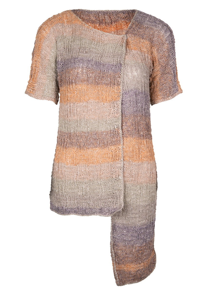 300 (350, 400) g of Lana Grossa Romanza (58% linen, 26% viscose, 16% cotton; 150 m/50 g) in Linen/Green- Grey/Light Grey/Blue-Purple/Grey/Light Orange (col 4). Size 4 mm needles; size 4 mm circular needle, 80 cm long; size 3.5 mm crochet hook; one 20 mm snap button in silver [by Union Knopf, item 500887, col 82]