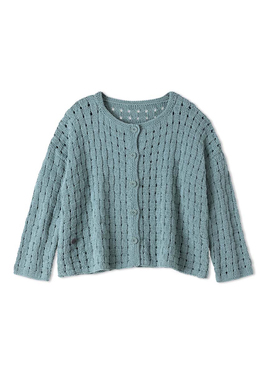 500 (550, 600, 650) g of Lana Grossa Setapura (100% silk; 200 m/50 g) in Mint Turquoise (col 13). Size 4 and 5 mm needles; size 4 mm circular needle, 60 cm long; five 20 mm buttons in light turquoise.
