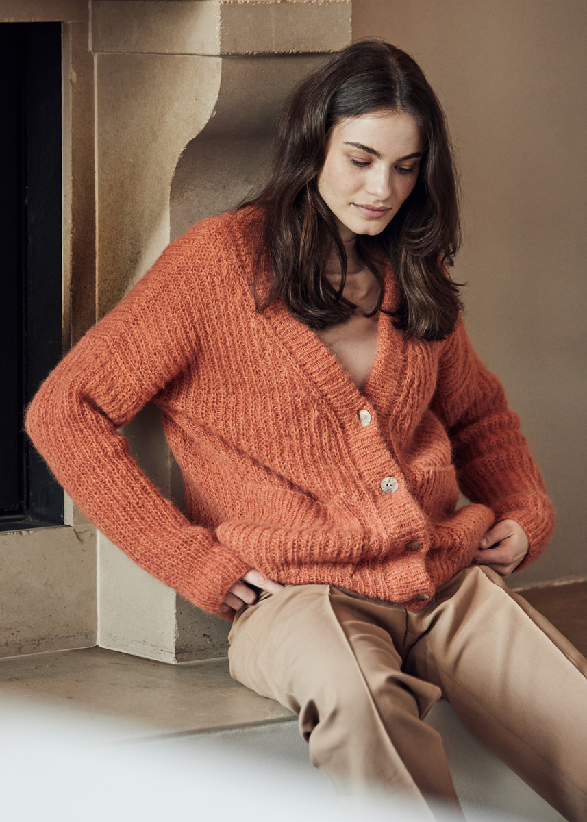 300 (300 - 325 - 350) g of Lana Grossa Setasuri Big (70% Suri alpaca, 20% silk, 10% Merino wool; 100 m/25 g) in Rust (col 508). Size 3 and 4 mm needles; size 3 mm circular needle, 80 cm long; four 22 mm buttons in beige