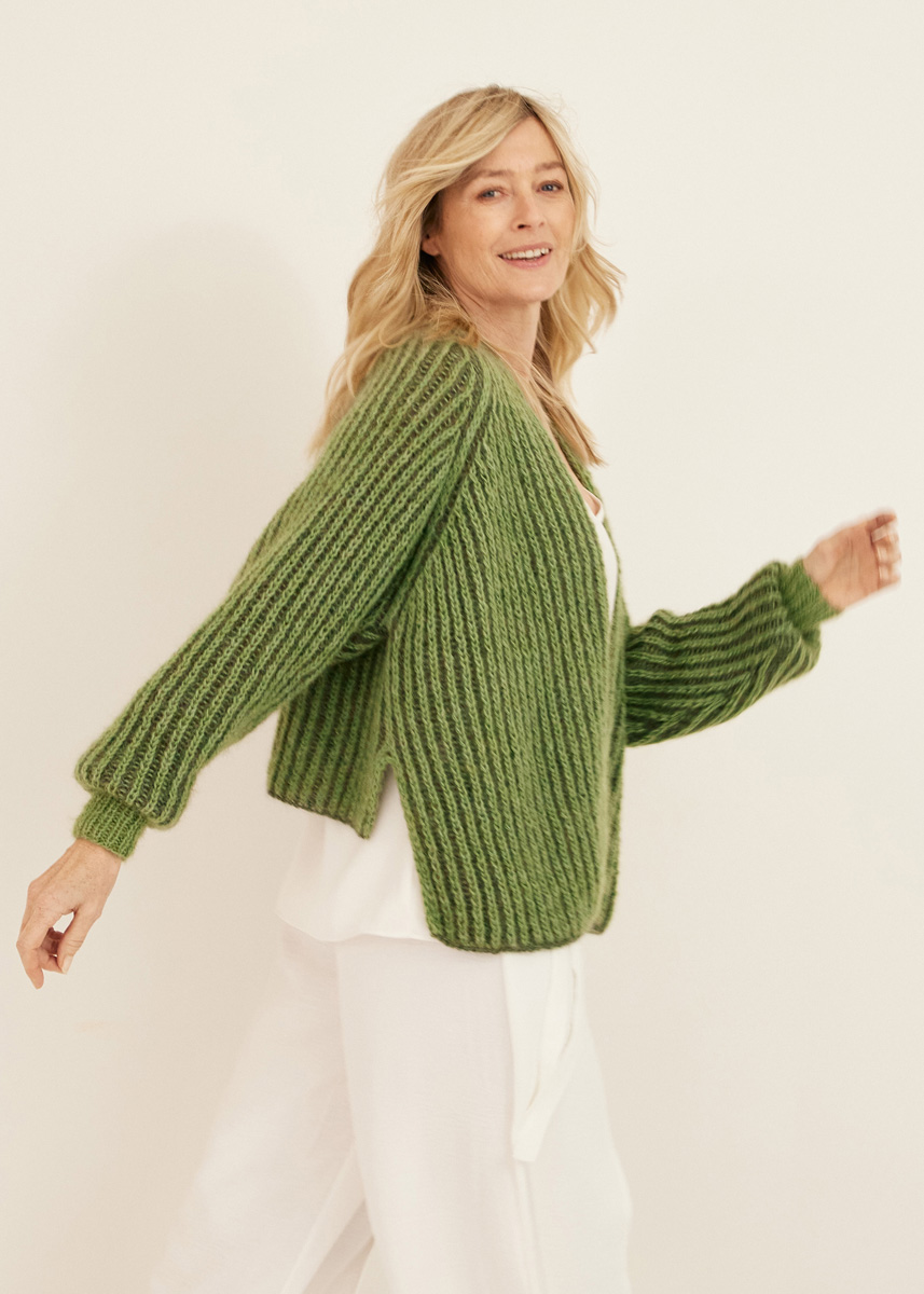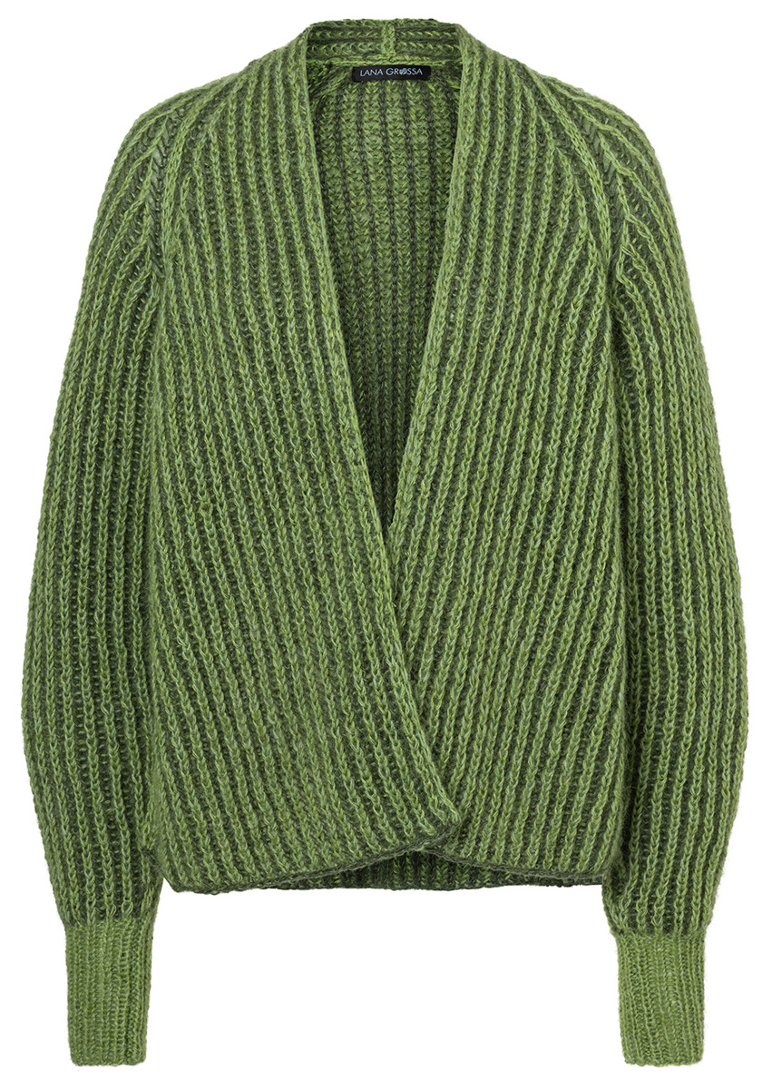 75 (100, 100) g each of Lana Grossa Silkhair (70% superkid mohair, 30% silk; 210 m/25 g) in Leaf Green (col 167) and Moss Green (col 127); 150 (200, 200) g each of Lana Grossa Ecopuno (72% cotton, 17% Merino wool, 11% baby alpaca; 215 m/50 g) in Light Green (col 20) and Loden (col 1). Size 4.5 and 5 mm circular needle; size 4 mm crochet hook
