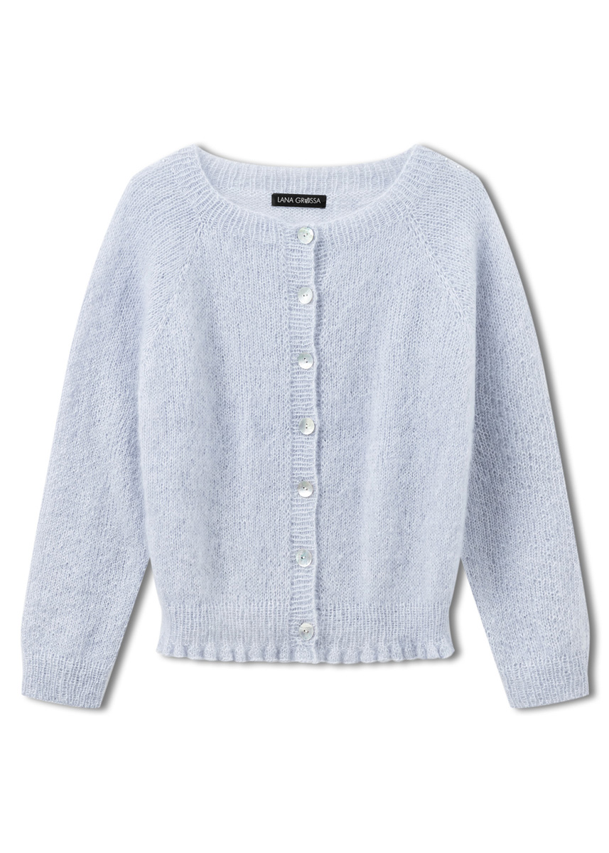 225 (275, 325) g of Lana Grossa Silkhair (70% superkid mohair, 30% silk; 210 m/25 g) in Light Grey (col 189). Size 3.5 and 4 mm circular needles, each 40 and 80 cm long; seven 20 mm buttons (by Union Knopf, item 37604, col 12).