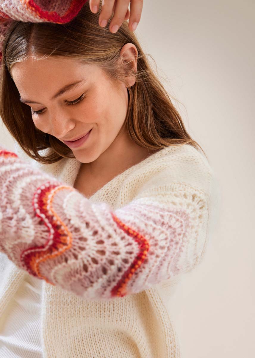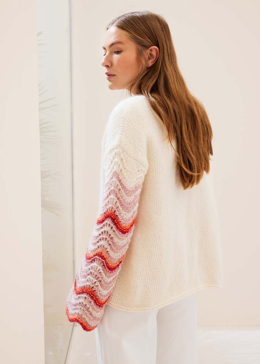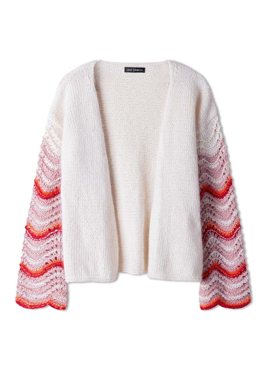 25 (25) g each of Lana Grossa Silkhair (70% superkid mohair, 30% silk; 210 m/25 g) in Candy Red (col 198), Pumpkin (col 190) and Pink (col 85) and 125 (150) g in White (col 117); 50 (100) g each of Lana Grossa Summer Softness (80% organic cotton, 20% superfine Merino wool; 130 m/50 g) in Red (col 7), Pumpkin (col 6) and Pastel Pink (col 10) and 350 (450) g in Cream (col 2). Size 6 mm needles; short size 5.5 mm circular needle.