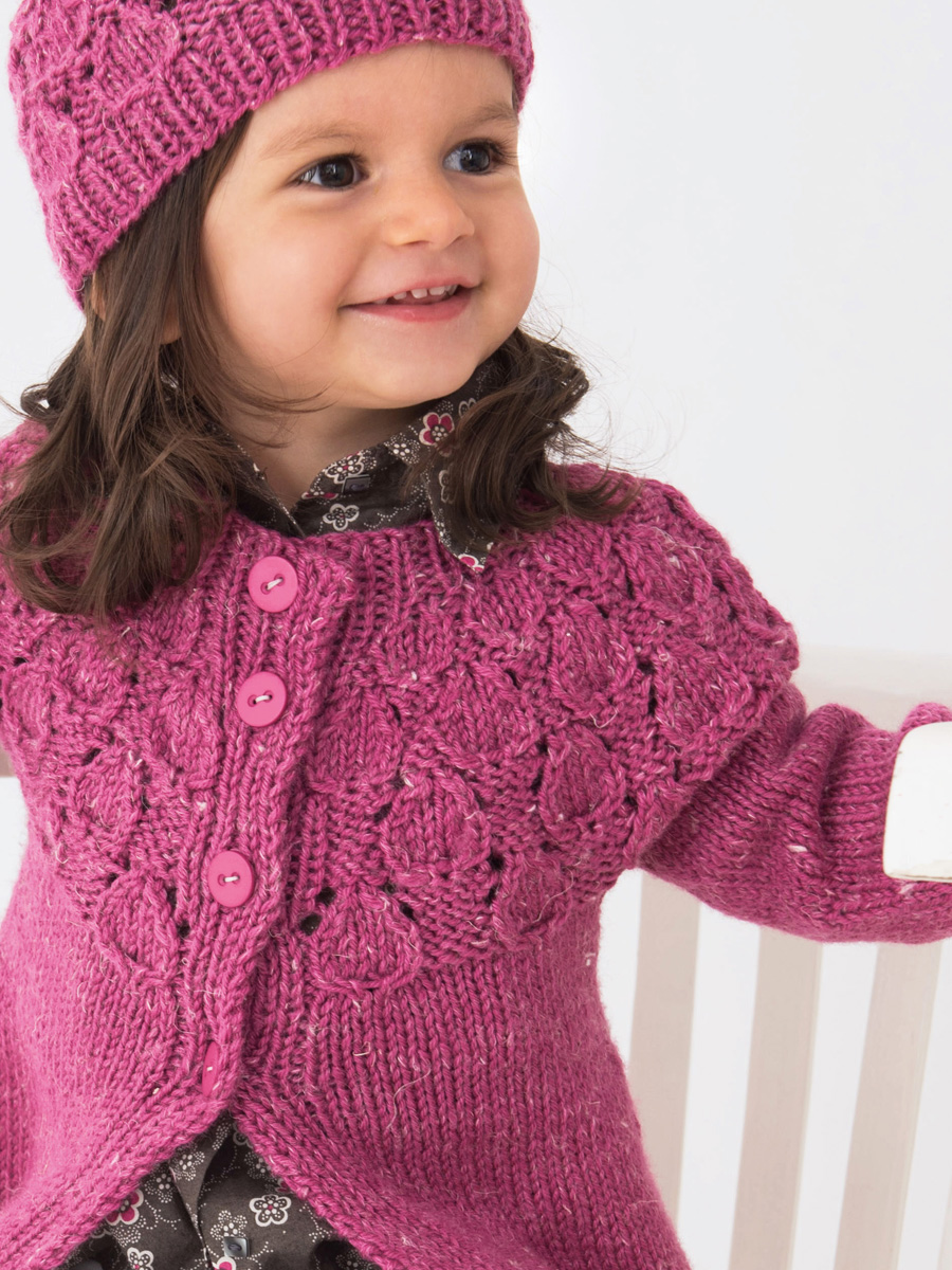 200 (200, 250) g of Lana Grossa Slow Wool Canapa (90% pure wool, 10% hemp; 100 m/50 g) in Fuchsia (col 12). Size 4.5 mm needles; size 4.5 mm circular needle, 40 cm long; one set size 4.5 mm double-pointed needles [dpns]; cable needle [cn]; four 17 mm buttons