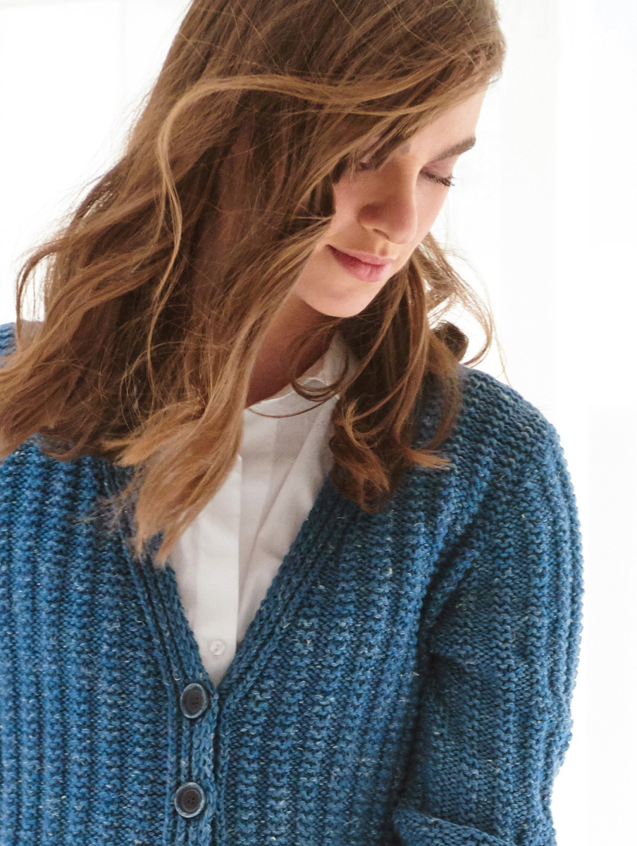 700 (750, 800) g of Lana Grossa Slow Wool Canapa (90% superwash Merino wool, 10% hemp; 100 m/50 g) in Ink (col 18). Size 5, 5.5 and 6 mm needles; three 22 mm buttons in blue/grey [by Union Knopf, item 452933]