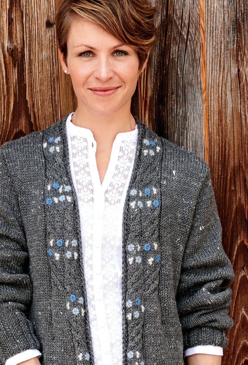 650 (700, 750) g of Lana Grossa Slow Wool Canapa (90% pure wool, 10% hemp; 100 m/50 g) in Dark Grey (col 5) and 25 g each of Lana Grossa Silkhair (70% superkid mohair, 30% silk; 210 m/25 g) in Jeans (col 103), Light Blue (col 42) and Natural (col 58). Size 5 and 5.5 mm needles; cable needle [cn]; 10 g of TOHO glass beads [by Emeraldis, col galvanized aluminum, 4 mm in diameter]