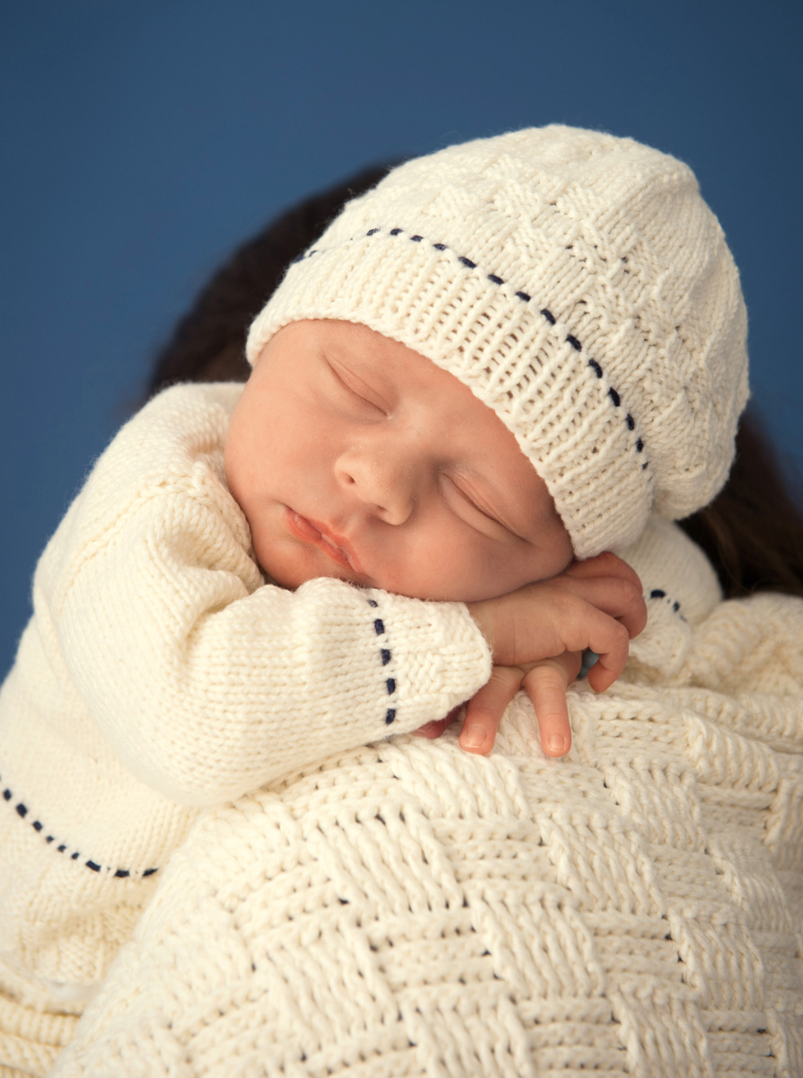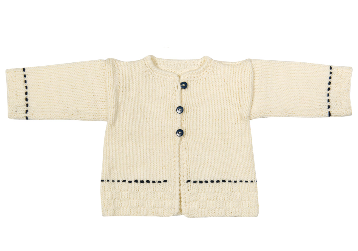 100 (100, 150) g of Lana Grossa Soft Cotton (70% cotton, 30% microfiber; 140 m/50 g) in Ecru (col 2) and 50 g in Midnight (col 17). Size 4 mm needles; size 3.5 mm crochet hook; tapestry needle; three 9 mm buttons