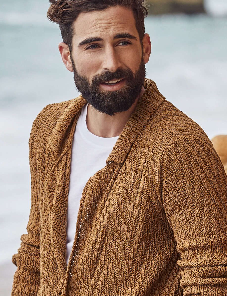 700 (750, 800) g of Lana Grossa Solo Lino Mélange (80% recycled linen [viscose], 20% linen; 105 m/50 g) in Cinnamon Mélange (col 122). Size 4 mm needles; one 23 mm button [by Union Knopf, item 36428, col 20]