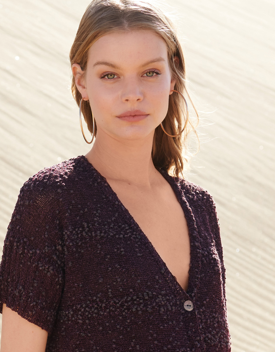 450 (500, 550) g of Lana Grossa Stromboli (60% cotton, 15% viscose, 15% polyamide, 10% silk; 150 m/50 g in Eggplant/Charcoal (col 104). Size 3 and 3.5 mm needles; size 3 mm circular needle, 100 cm long; size 3 and 3.5 mm circular needles, each 60 cm long; four 18 mm mother-ofpearl buttons in black [by Union Knopf, item 452665, col 80]