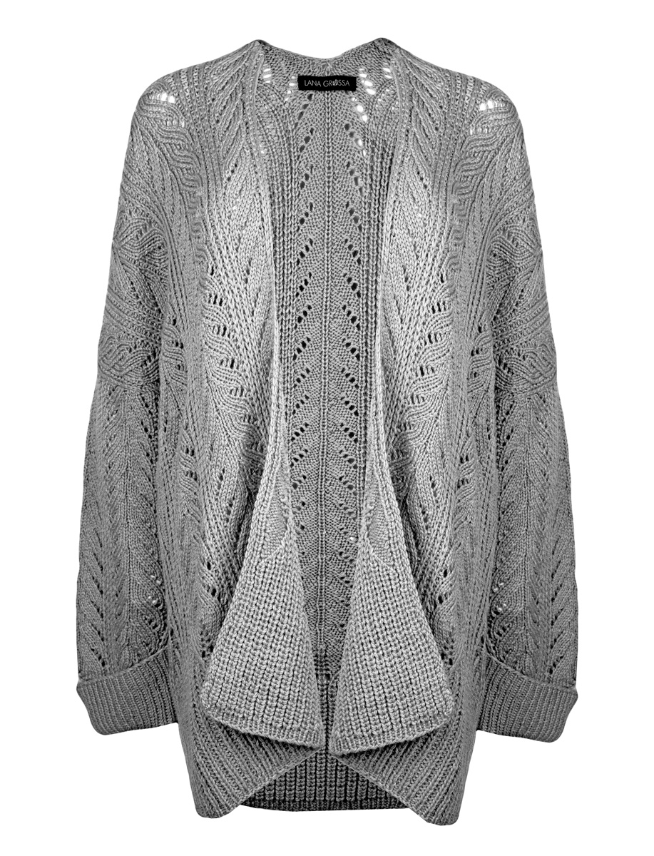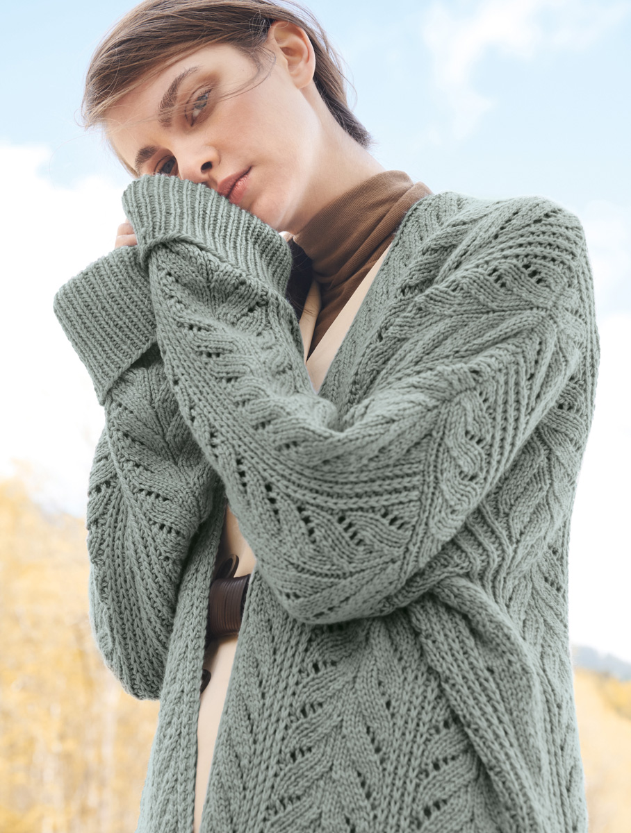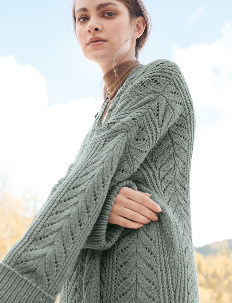 700 (750, 800, 850) g of Lana Grossa Tre Seta (40% Merino wool, 35% silk, 20% baby alpaca, 5% viscose; 130 m/50 g) in Grey/Green (col 6). Size 4 mm needles; size 3.5 mm crochet hook