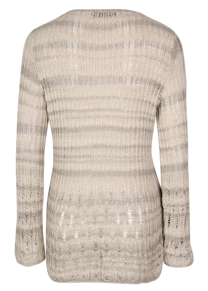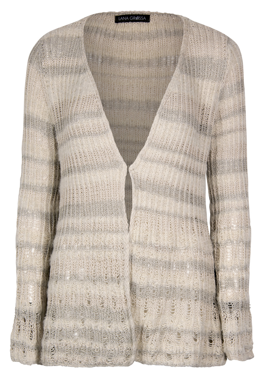 400 (450, 500) g of Lana Grossa Trefili (62% cotton, 26% viscose, 12% linen; 160 m/50 g) in Cream/Light Grey (col 11). Size 4.5 mm needles; size 3.5 mm crochet hook; thin leather band in dark brown, 20 cm long