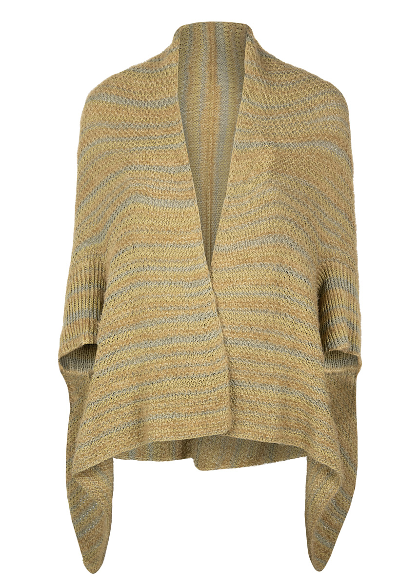 450 (500, 550) g of Lana Grossa Tref ili (62% cotton, 26% viscose, 12% linen; 160 m/50 g) in Camel/Ochre (col 10). Size 4 mm circular needle, 80 cm long; one set size 3 mm double-pointed needles [dpns.]