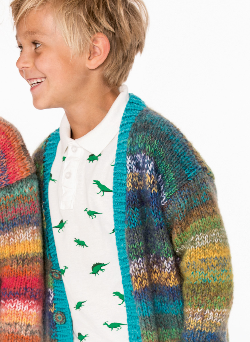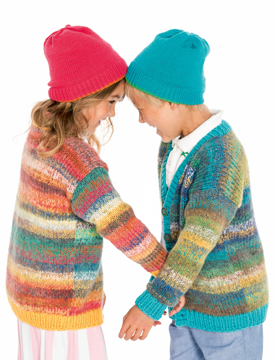 200 g of Lana Grossa Tutti (30% polyamide, 25% mohair, 25% superfine alpaca, 20% Merino wool; 330 m/100 g) in Violet/Turquoise/Jade/Petrol/Yellow/Ocher (col 6); 50 g each of Lana Grossa Cool Wool (100% pure wool; 160 m/50 g) in Apple (col 504), Turquoise Blue (col 502), Cobalt Blue (col 555), Yellow (col 419), White (col 431) and Dark Grey Mélange (col 412) and 150 g of Lana Grossa Bingo (100% pure wool; 80 m/50 g) in Turquoise (col 133). Size 5 and 6 mm needles; size 5 mm circular needle, 100 cm long; five 23 mm buttons in turquoise [by Union Knopf, item 452738].
