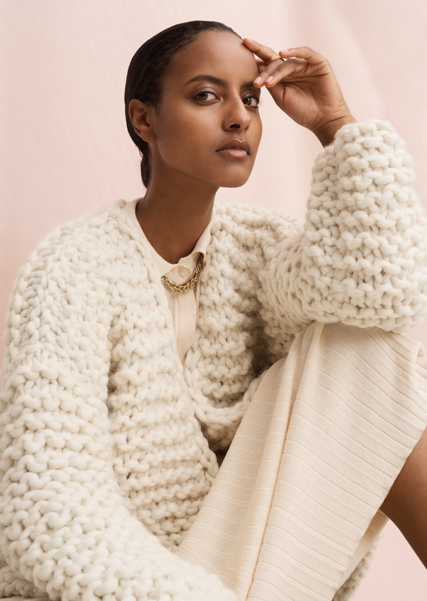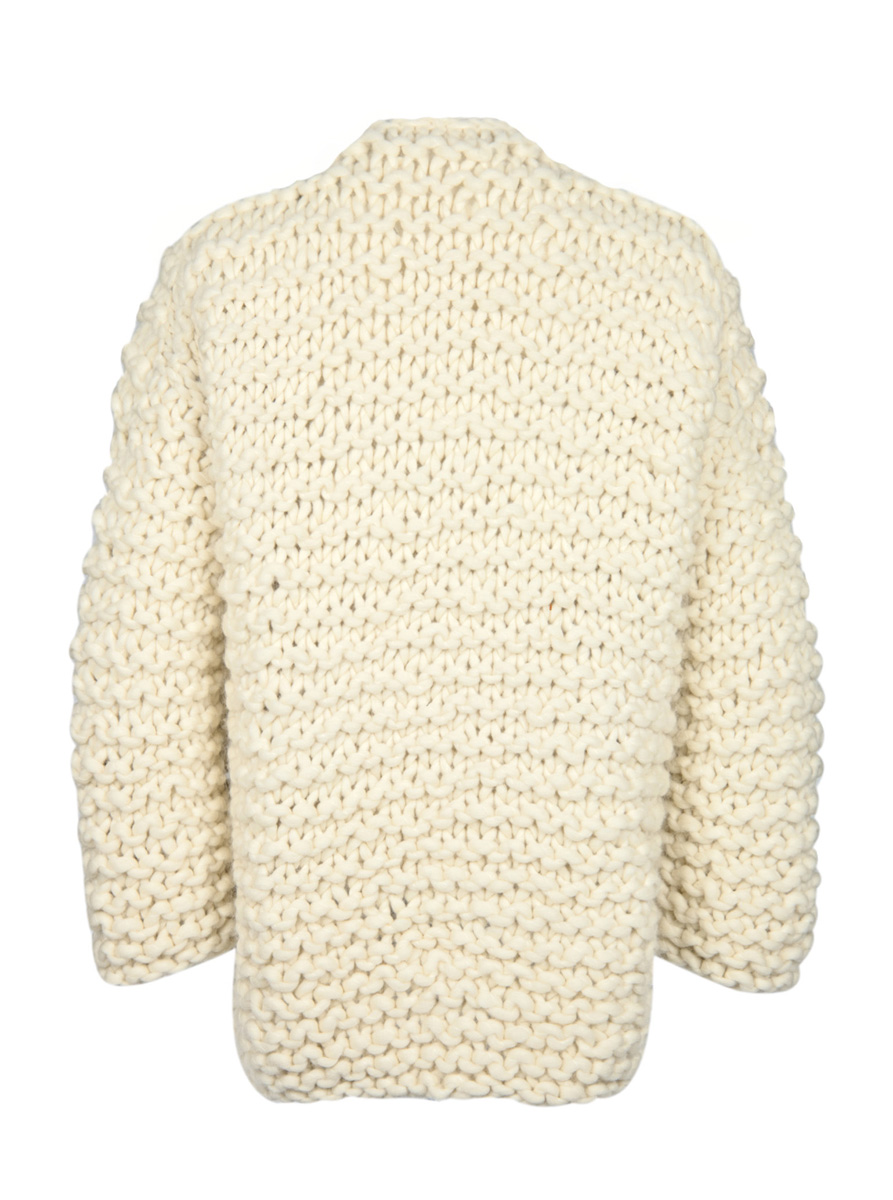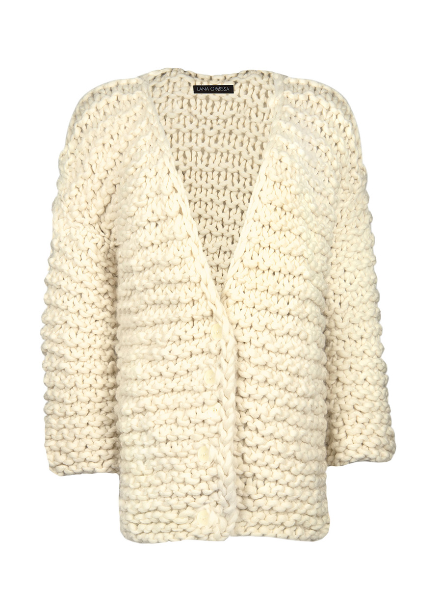 1300 (1400, 1500) g of Lana Grossa Weekend (69 % pure wool, 30 % alpaca, 1 % cotton; 35 m / 100 g) in Natural (col 1). Size 20 mm needles; three 25 mm buttons