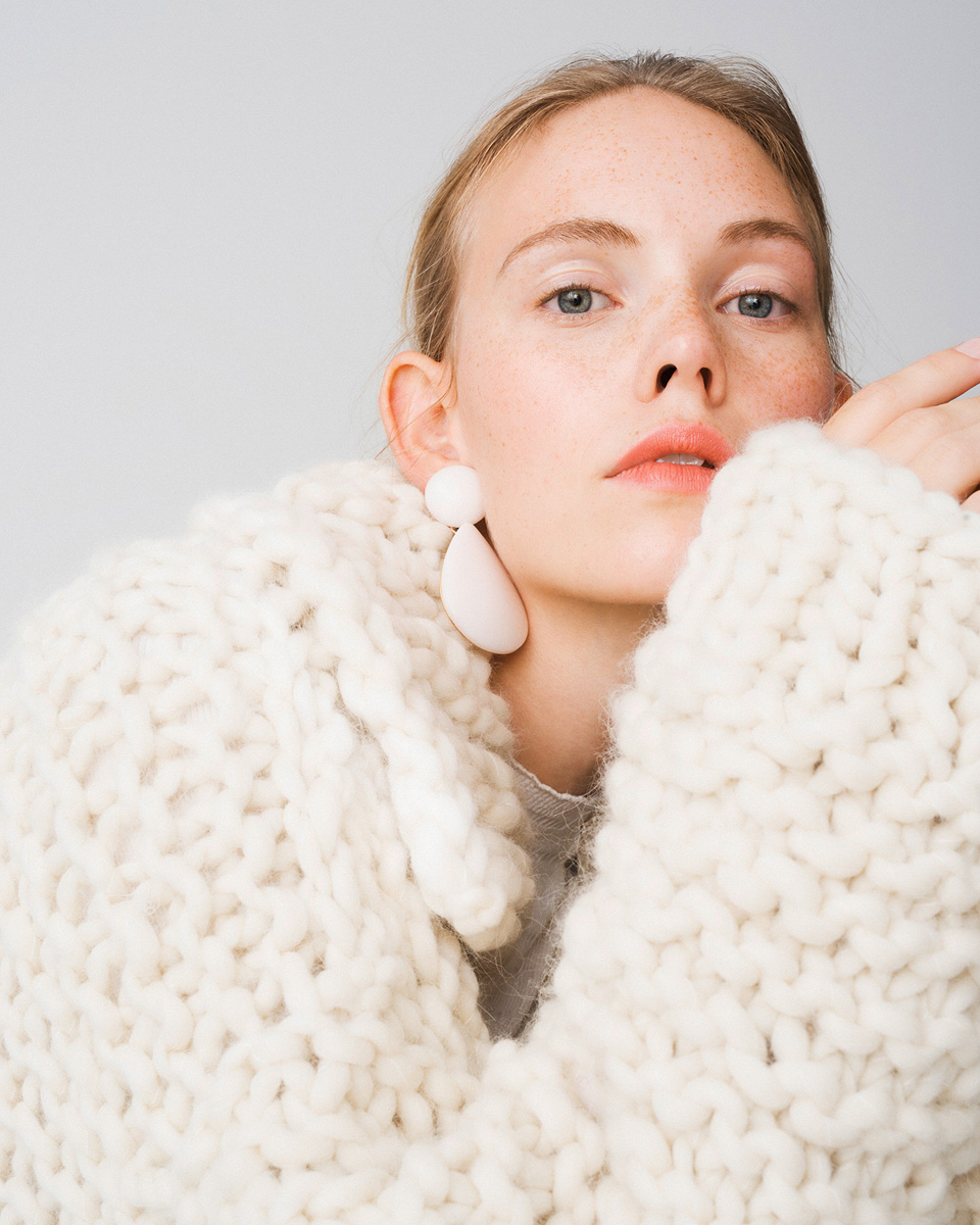 1500 (1700, 1900) g of Lana Grossa Weekend (69% pure wool, 30% alpaca, 1 % cotton; 35 m/100 g) in Natural (col 1). Size 15 mm needles; size 12 and 15 mm circular needles, each 60 cm long; three 20 mm snap buttons