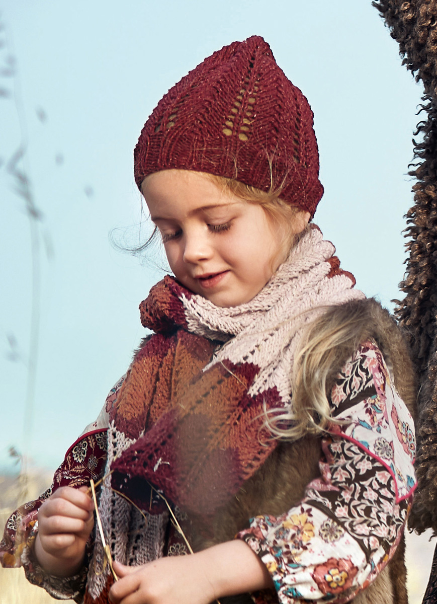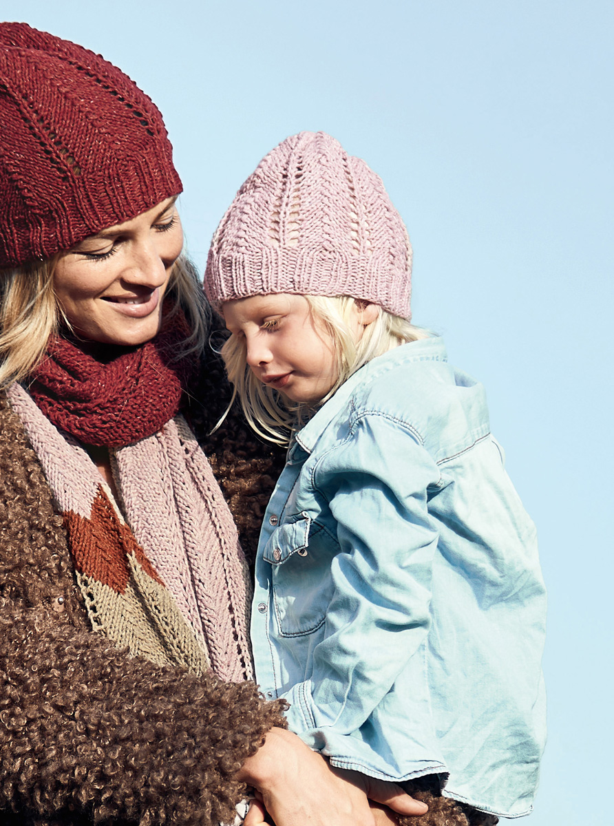 50 g of Lana Grossa Mary’s Tweed (33% baby alpaca, 30% Merino wool, 26% polyamide, 11% silk; 135 m/50 g) in Dark Red Mélange (col 5) or Pink Mélange (col 4). One set each size 4.5 and 5 mm double-pointed needles [dpns]