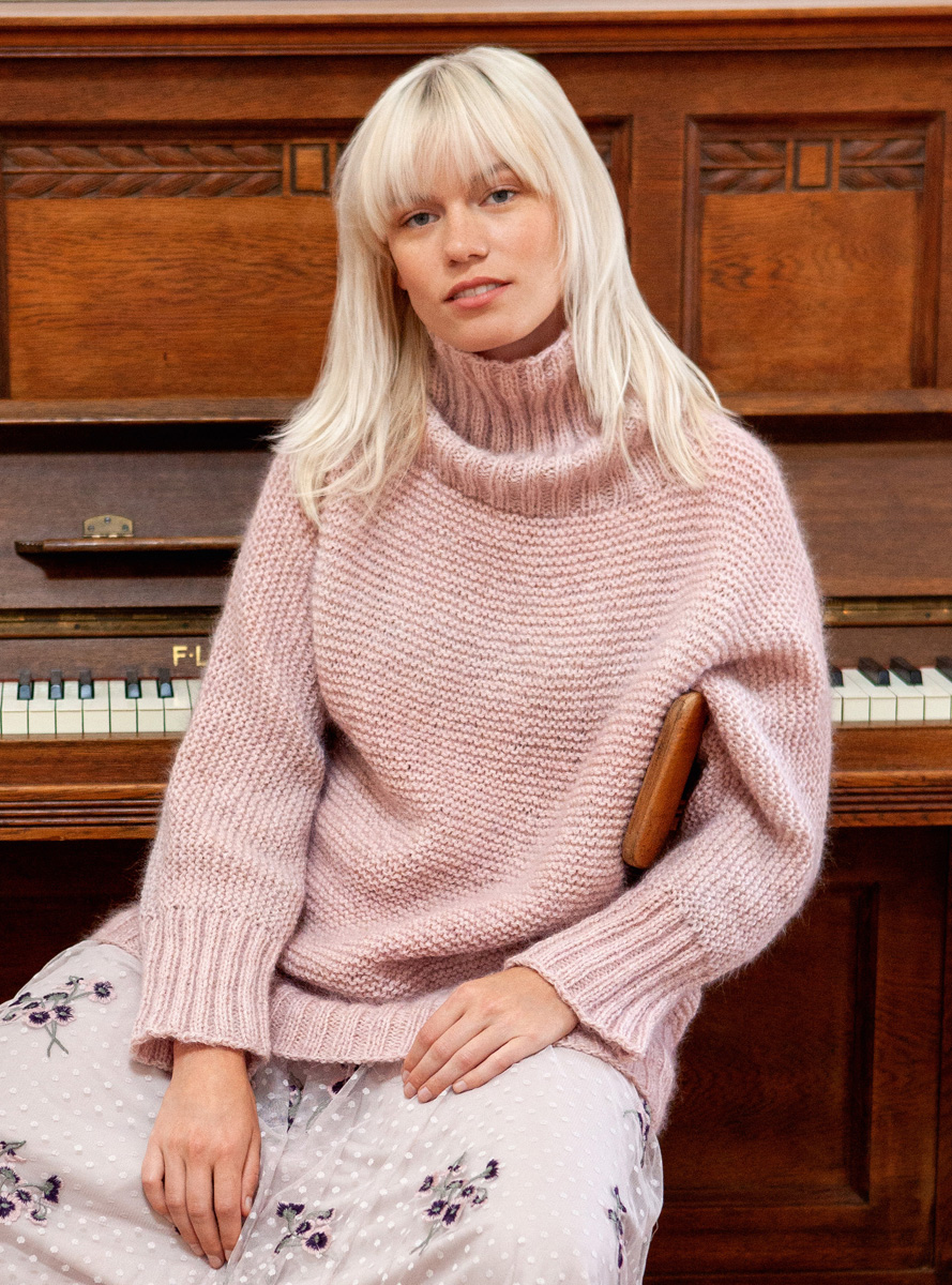 200 g of Lana Grossa Gomitolo Silkhair (65% superkid mohair, 30% silk, 5% pure wool; 800 m/100 g) in Beige Mélange (col 201) and 400 (450) g of Lana Grossa Landlust Merino 180 (100% superwash Merino wool; 180 m/50 g) in Pastel Pink (col 202). Size 6 and 7 mm needles; size 6 and 7 mm circular needles, each 50 cm long