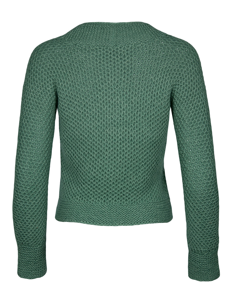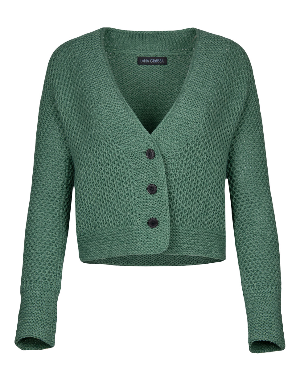 400 (450) g of Lana Grossa Fourseason (45% extrafine Merino wool, 40% organic cotton, 15% recycled cashmere; 105 m/50 g) in Green (col 7). Size 5.5 mm needles; size 5.5 mm circular needle, 100 cm long; size 5 mm circular needle, 60 cm long; size 4.5 mm crochet hook; three 20 mm buttons in black/brown [by Union Knopf, item 453059, col 7882]