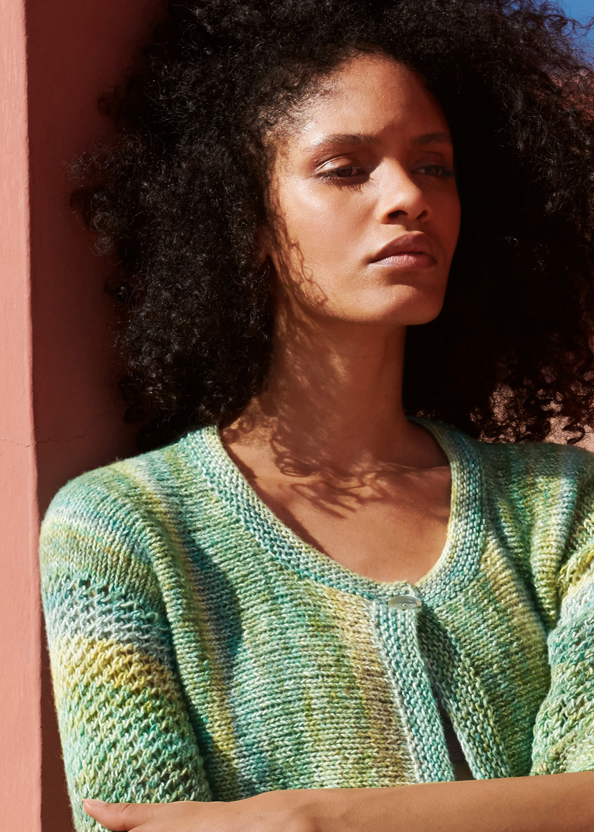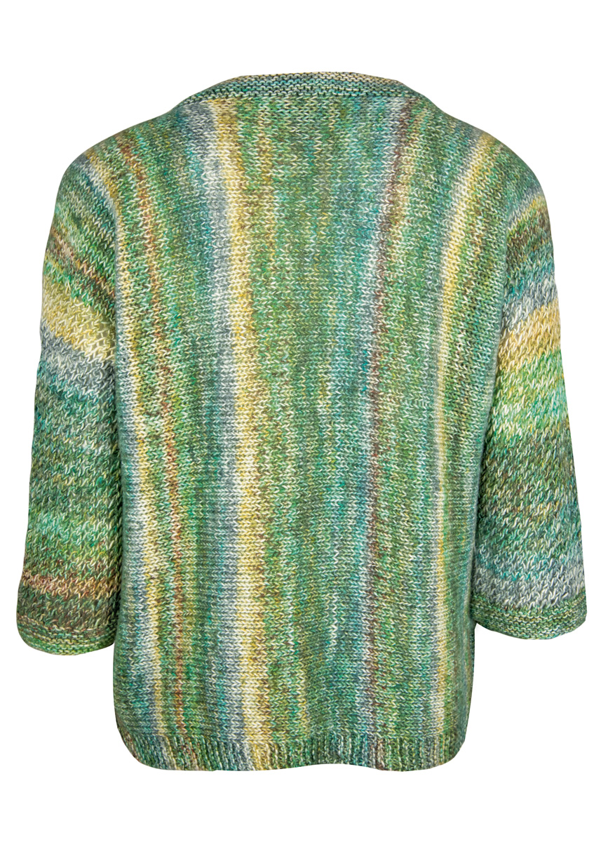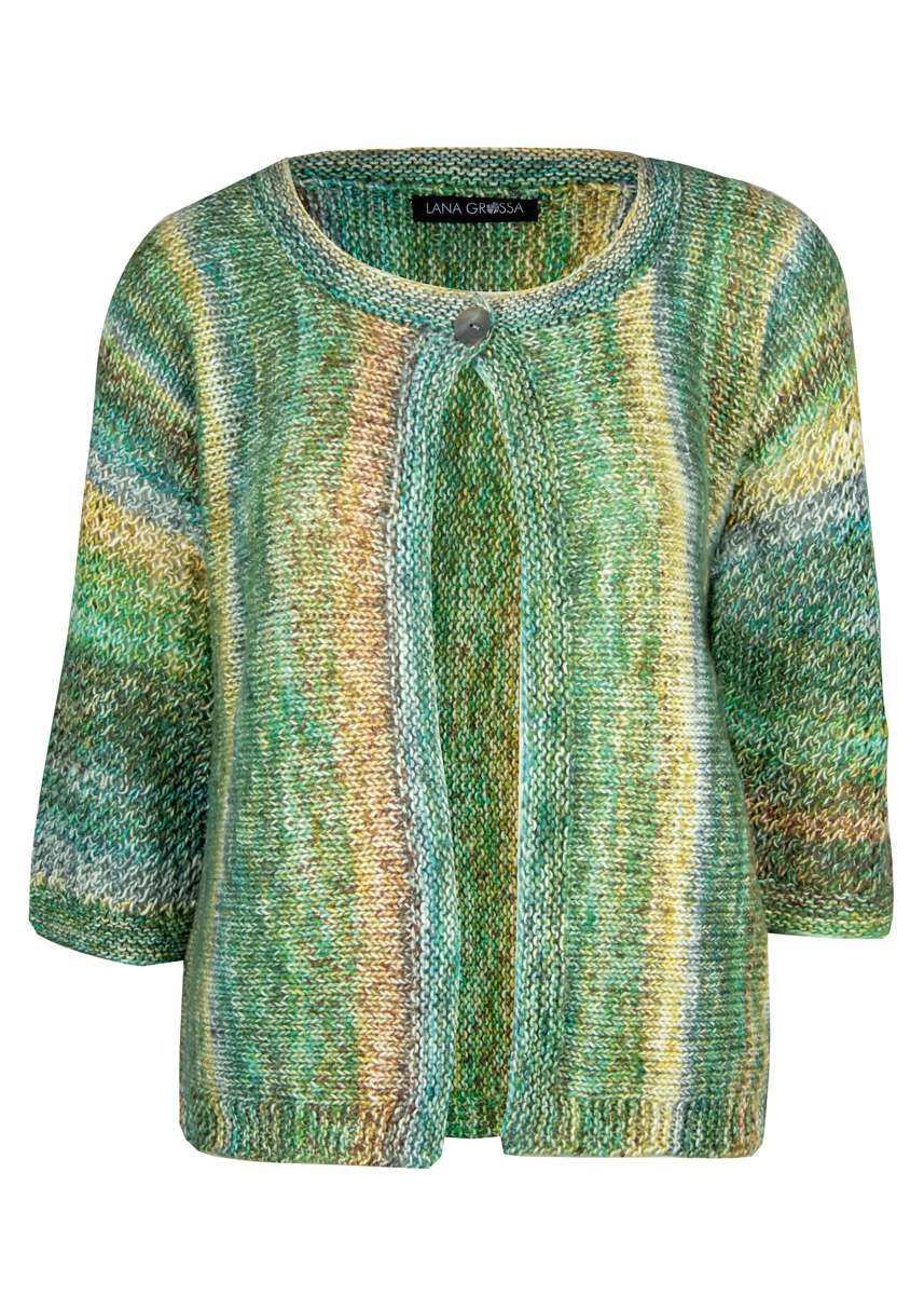 350 (400, 450) g of Lana Grossa Tropico (70% cotton, 30% Merino wool; 125 m/50 g) in Grey/White/Turquoise- Grey/Mustard/Olive/Khaki (col 5). Size 4, 4.5 and 5 mm needles; size 5 mm circular needle, 100 cm long; size 4 mm circular needle, 60 cm long; one 23 mm mother-of-pearl button in beige/green [by Union Knopf, item 46286, col 14]