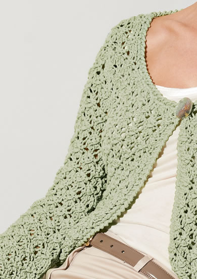 Approx. 450 (500) g of Lana Grossa Cotofi ne (70% cotton, 30% polyamide; 90 m/50g) in Grège (col 34); size 6.5 – 8 mm needles, size 5.5 mm crochet hook, one button.