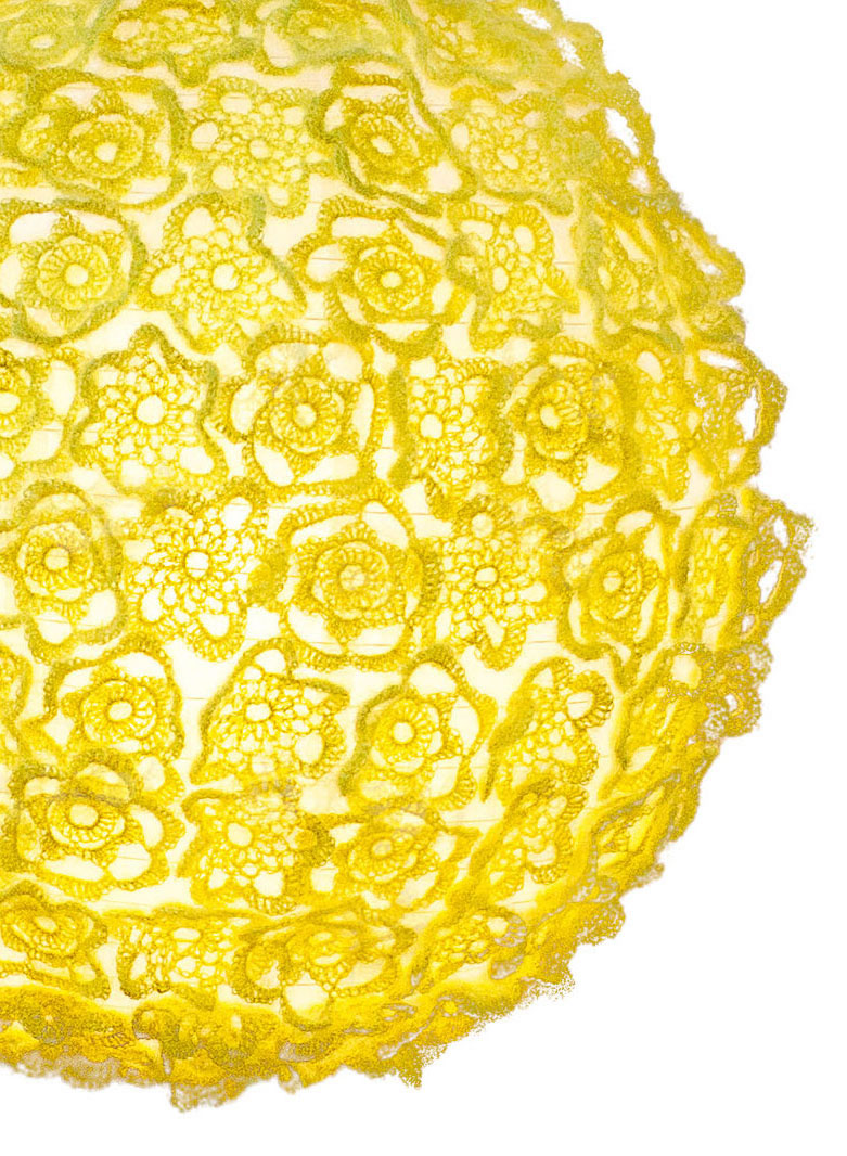 275 g of Lana Grossa Silkhair (70% superkid mohair, 30% silk; 210 m/ 25 g) in Mustard (col 90). Size 4 mm crochet hook; paper balloon lamp, 60 cm in diameter; fabric glue.