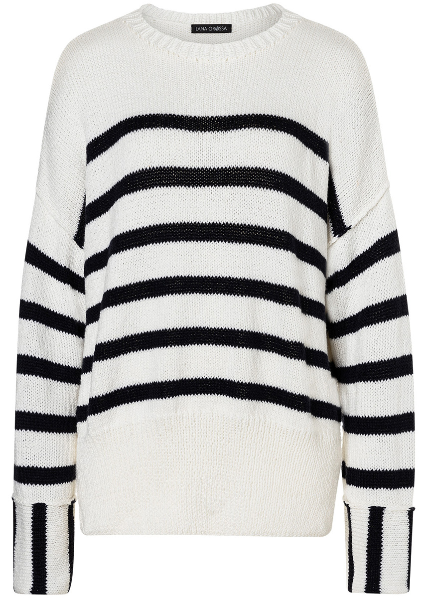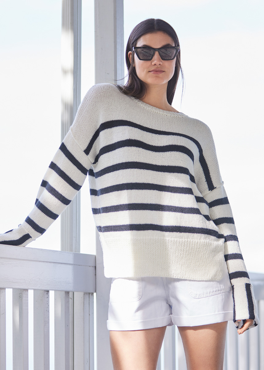 350 (400, 450) g of Lana Grossa Alta Moda Cotolana (45% Merino wool, 45% Pima cotton, 10% polyamide; 150 m/50 g) in Light Beige (col 19) and 150 (150, 200) g in Midnight Blue (col 29). Size 4 mm needles; size 4 mm circular needle, 40 cm long