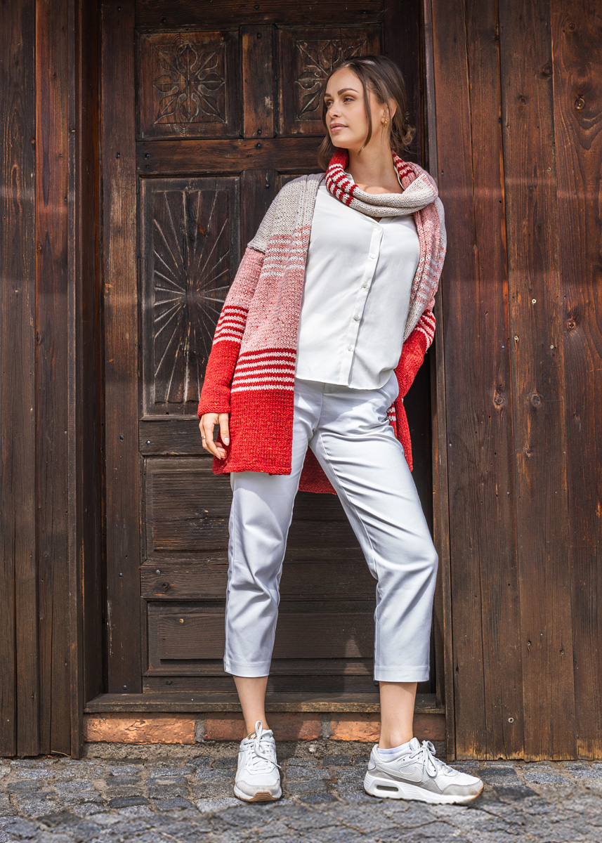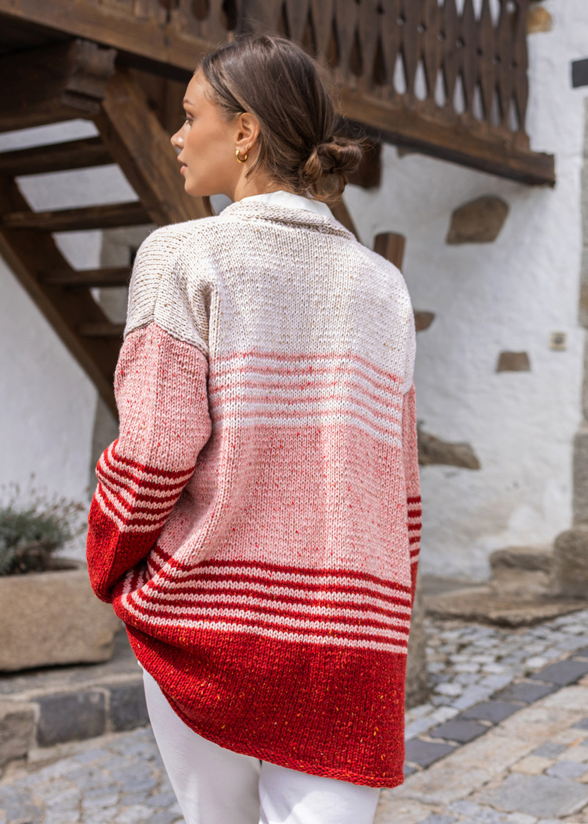 The cardigan has a length of 75 (75 - 77 - 79 - 81 - 83) cm and a positive ease of 32 cm at 80 cm chest circumference (32 cm at 88 cm chest circumference - 28 cm at 96 cm chest circumference - 28 cm at 104 cm chest circumference - 24 cm at 116 cm chest circumference - 24 cm at 128 cm chest circumference)