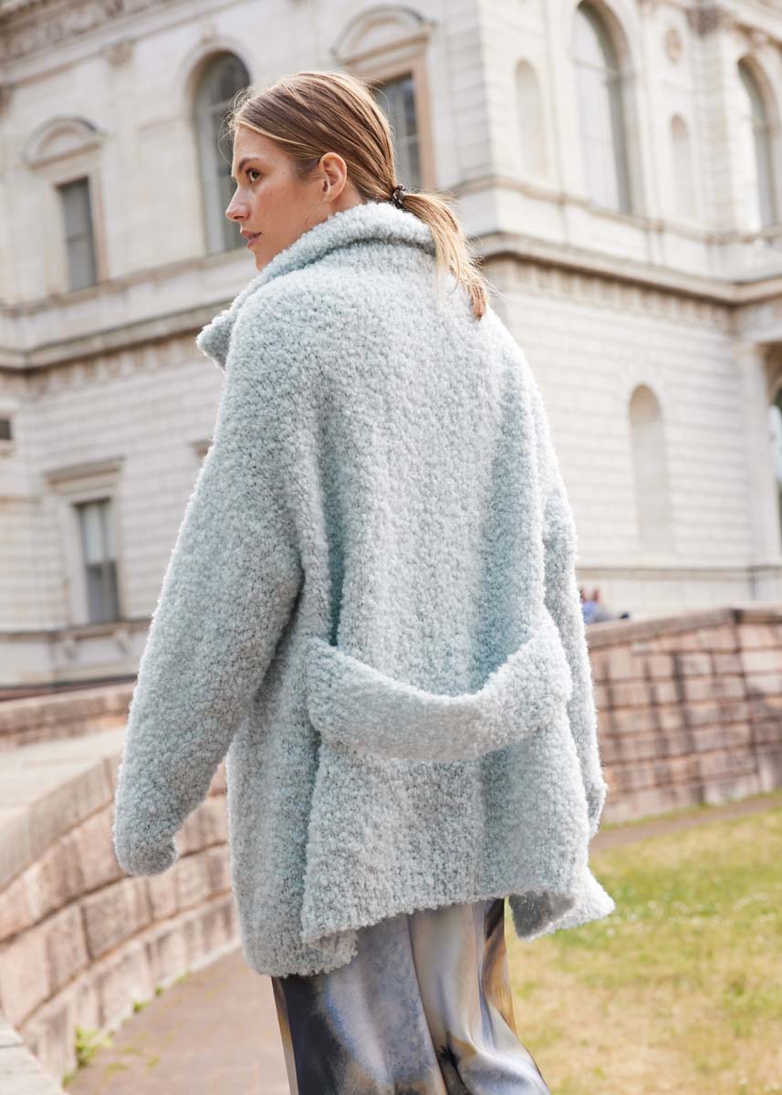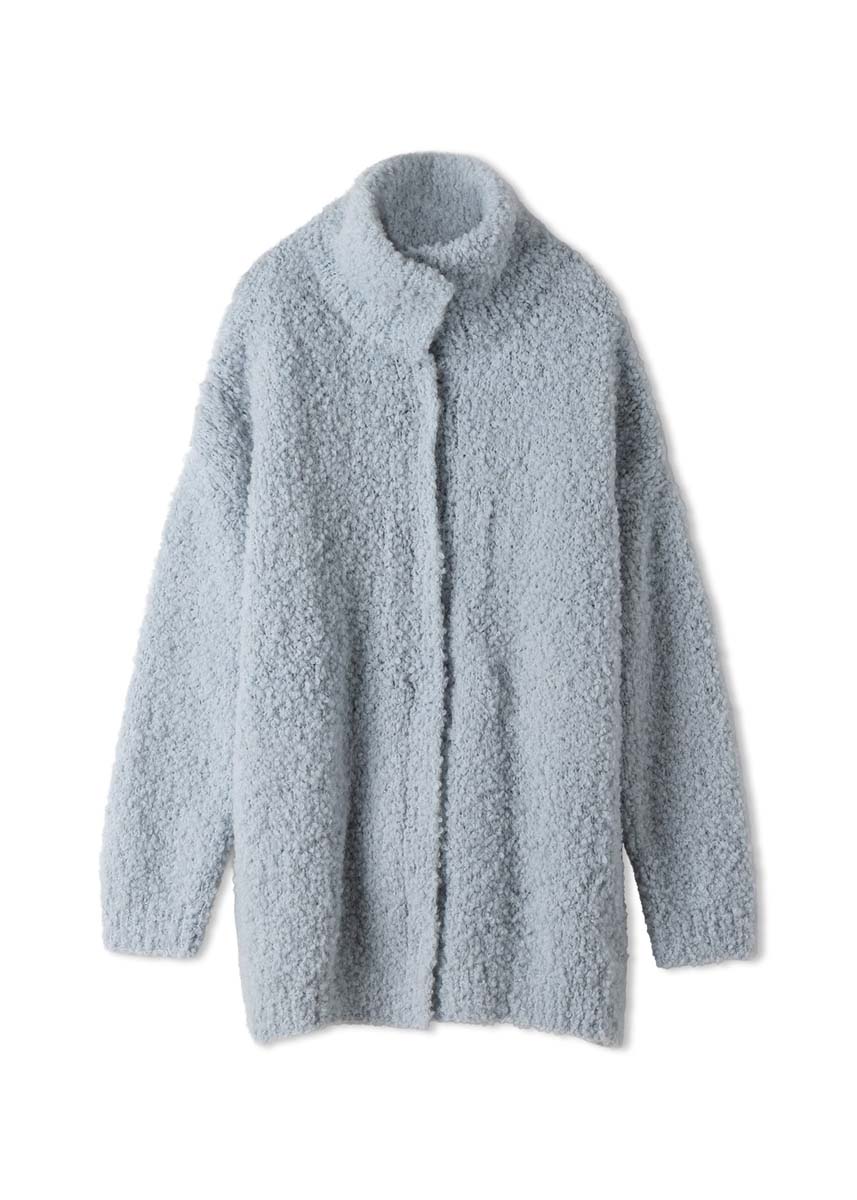 650 (750) g of Lana Grossa Orsetto (60% Merino wool, 40% superfine alpaca; 75 m/50 g) in White Blue (col 1). Size 5 and 6 mm needles; size 6 mm circular needle, 60 cm long; six 25 mm transparent snap buttons.