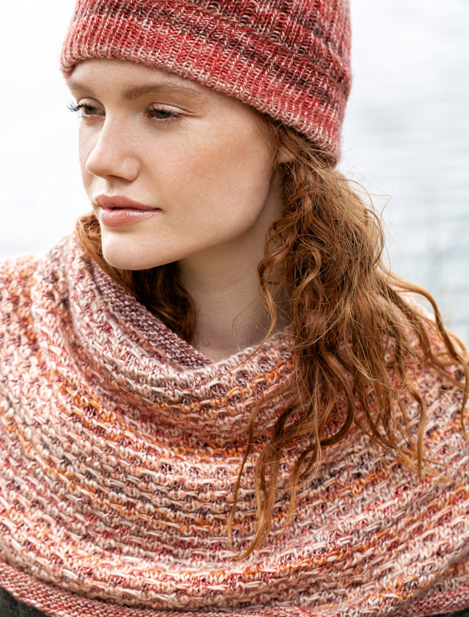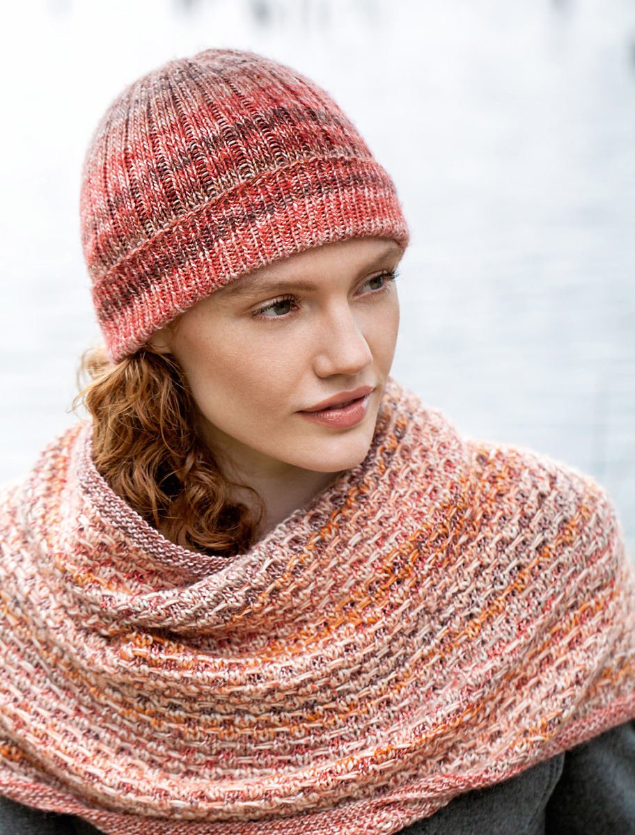 200 g of Lana Grossa Gomitolo Duo 250 (45% Merino wool, 30% bamboo, 25% polyamide; 250 m/100 g) in Pastel Pink/Antique Pink/Red/Wine/Burgundy/Grey-Brown (col 904) and 100 g of Lana Grossa Gomitolo Duo 400 (45% Merino wool, 30% bamboo, 25% polyamide; 400 m/100 g) in Natural/Peach/Salmon/Orange/Taupe (col 803). Size 3.5 and 4.5 mm circular needles, each 80 cm long