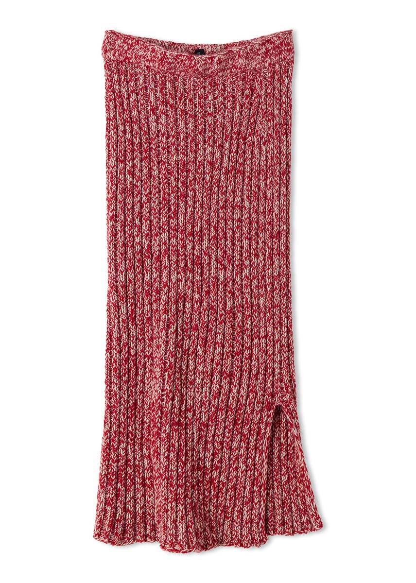 Lana Grossa Ecopuno (72 % Cotton, 17 % Virgin wool Merino, 11 % Alpaca, approx. 215 m/50 g), 250 (300 - 350) g pearl beige (col 66) and 250 (300 - 350) g cherry red (col 47); 1 circular knitting needle size 4,5 mm, 80 cm long; 2 stitch marker; elastic band 4 cm wide, approx. 80 (86 - 95) cm