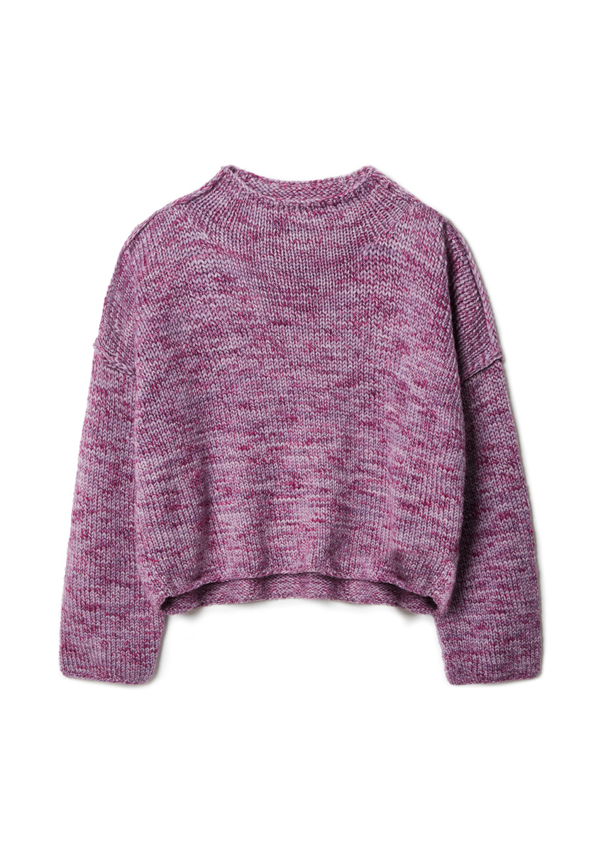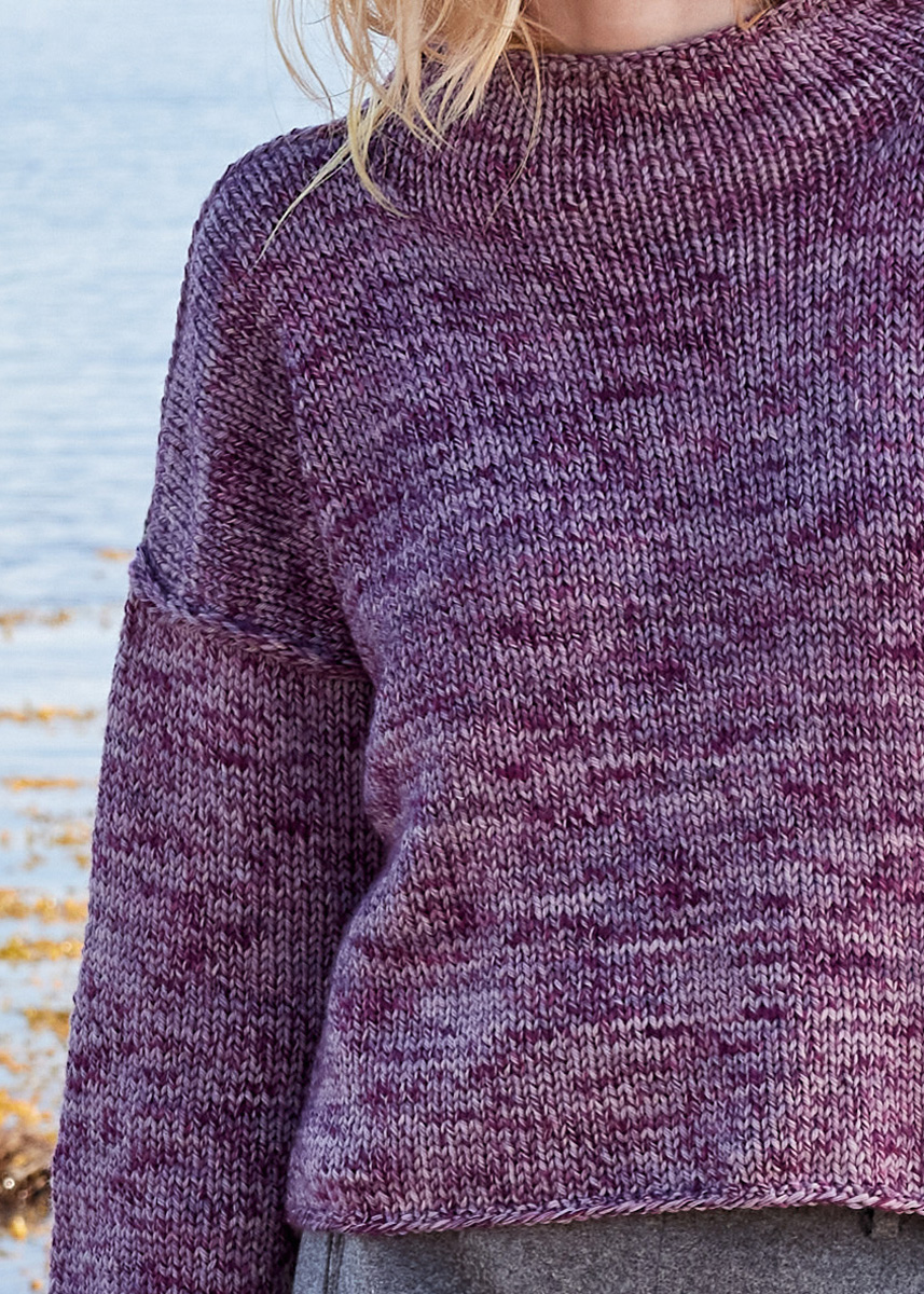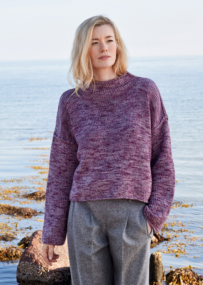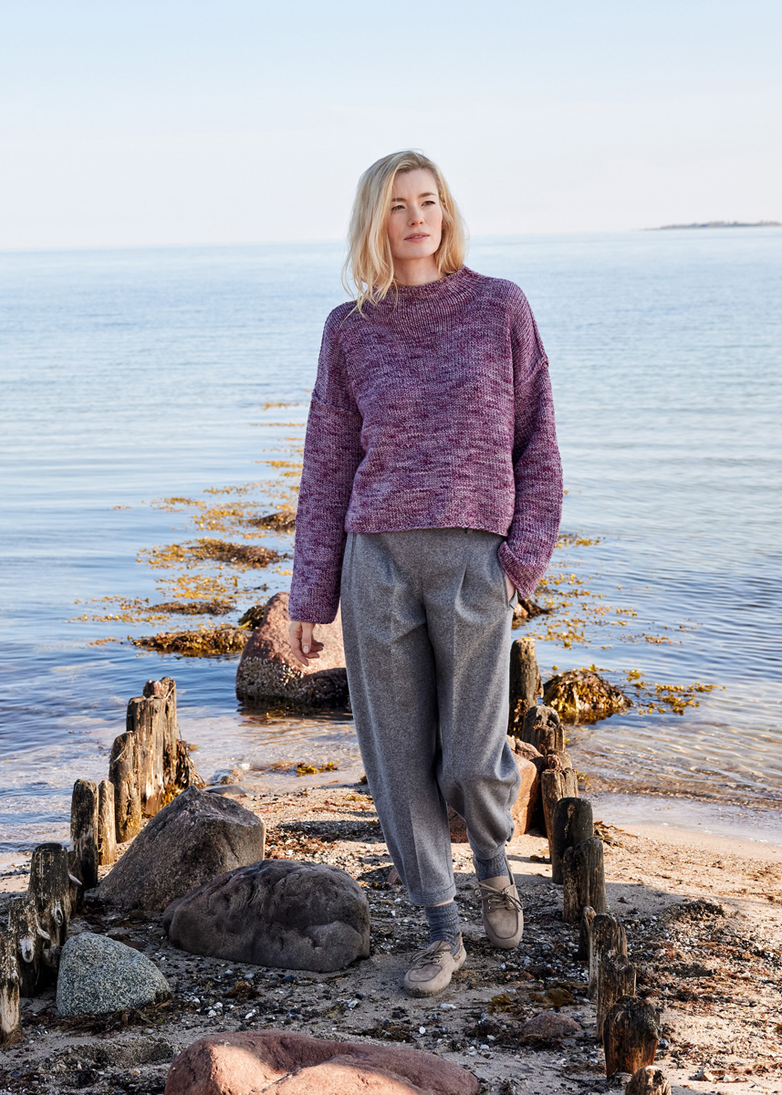 550 (600, 650, 700) g of Lana Grossa Vintage Chunky (100% Merino wool; 80 m/50 g) in Grey Beige/Mauve (col 7). Size 5 and 6 mm needles